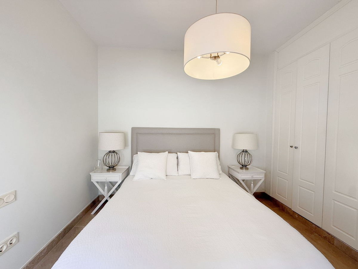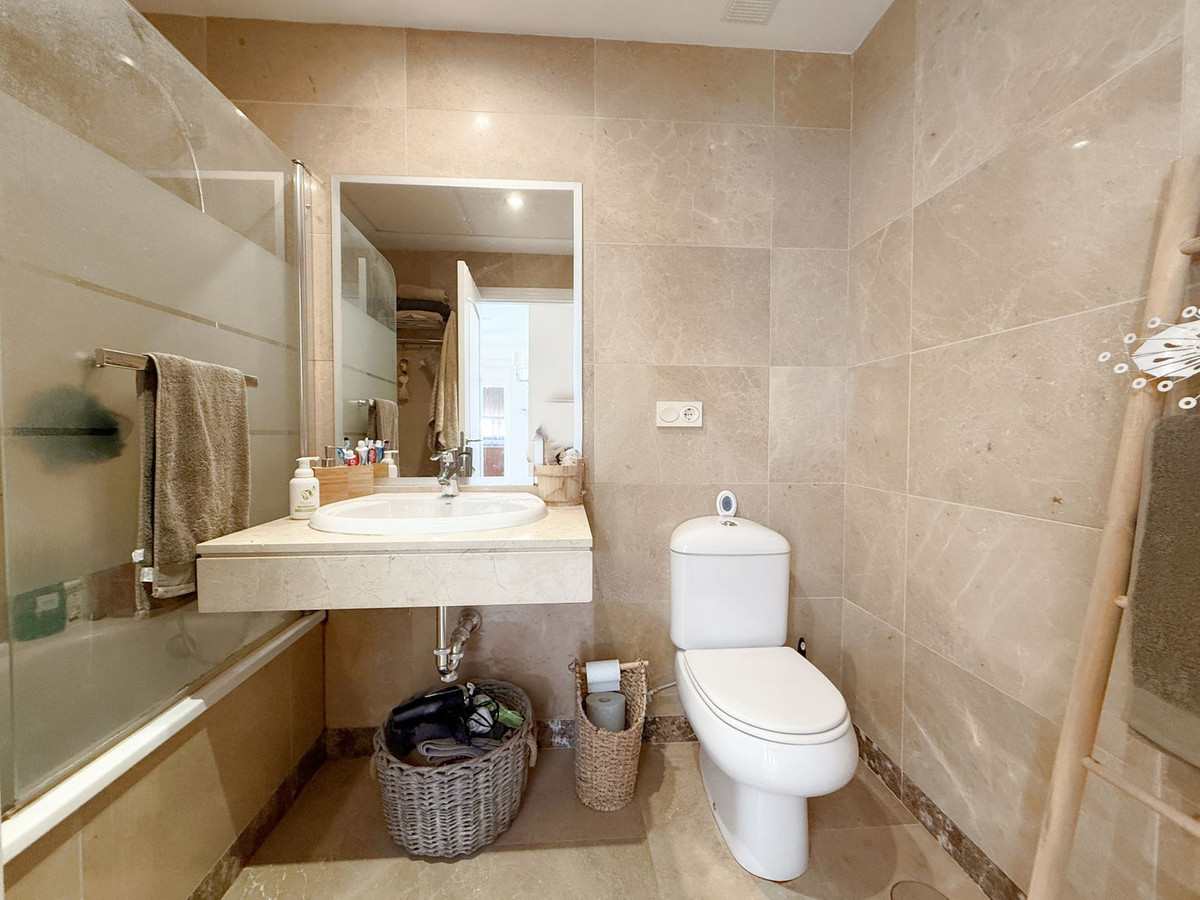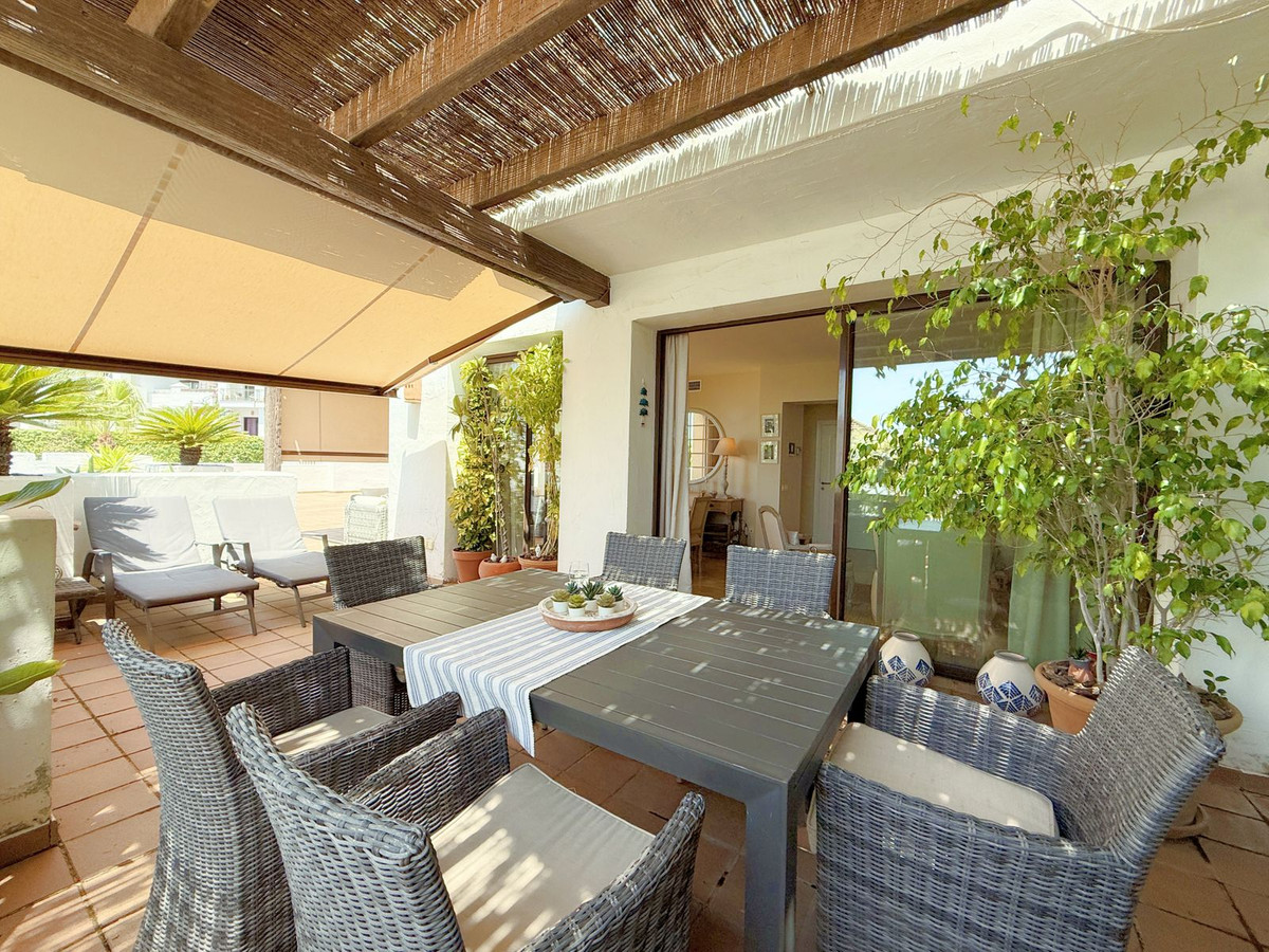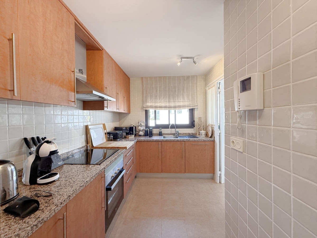 The property is in excellent condition and move-in ready. Upon entering, you’re welcomed by a spacious and bright living-dining area with large windows that open onto a covered terrace with retractable awnings, perfect for year-round enjoyment. It features two double bedrooms and two full bathrooms (one en suite), all tastefully decorated in a natural, elegant style that promotes comfort and tranquility. The fully equipped kitchen is designed for functionality and ease of use.