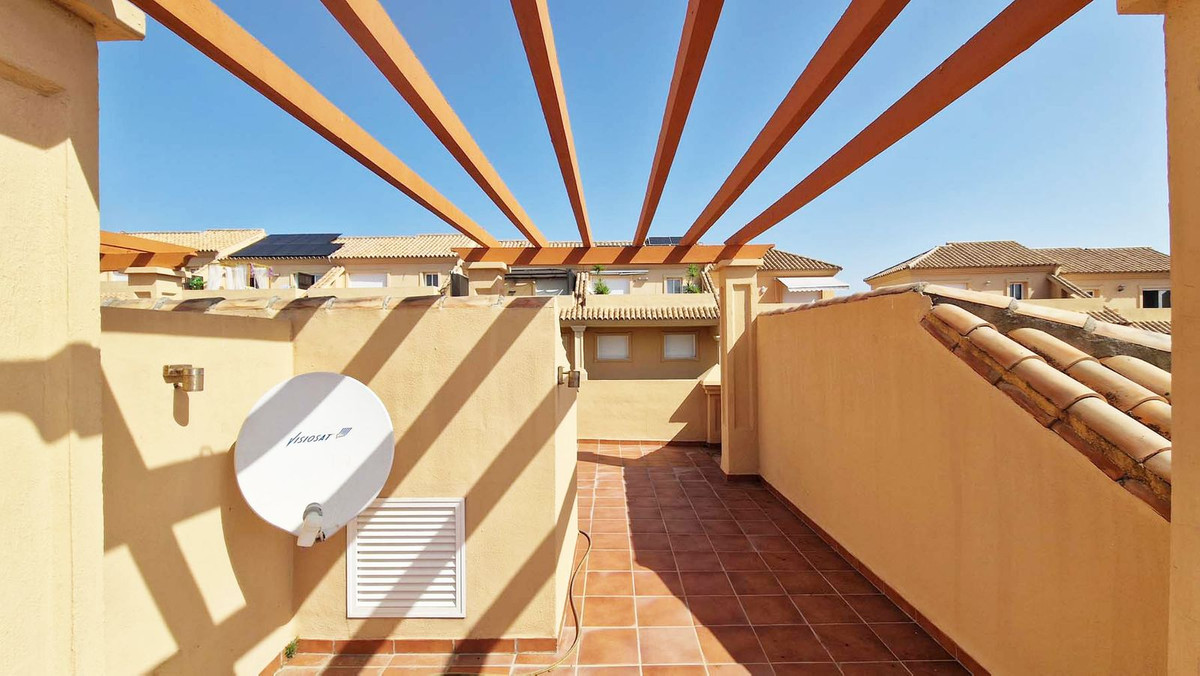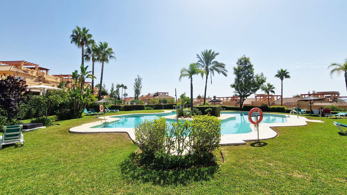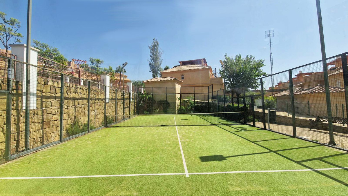 VERY NICE SEMI-DETACHED HOUSE WITH SEA VIEWS FOR SALE IN ESTEPONA!! This corner townhouse is located in the sought-after, secure, private development of Galera Park. Located 200 meters from the seafront, its location within the development protects it from the noise of the coastal road. The house is built on four floors. All floors have an elevator. The first level is the private underground garage, where two vehicles can easily be parked. The owner replaced the garage door with a much better-quality automatic one when he bought the property. The second floor consists of a beautiful living/dining room, a fully equipped semi-open kitchen, and a guest toilet. The living room leads out onto a charming terrace with a bit of sea view and a large, pleasant private green area overlooking the pool and the sea. On the first floor, there are three bedrooms and two bathrooms. The master bedroom has an en-suite bathroom and leads out onto a terrace that provides access to the fourth floor, the solarium, from where you can observe the surroundings and enjoy splendid sea views. You can see the sea from the living room terrace and also from the master bedroom terrace. The house has always been very well maintained by its owners, who even soundproofed the side wall of their only neighbor. Many shops are nearby, including two large supermarkets! This property is being sold partially furnished. All appliances remain. Ideal property for a family, either as a primary residence or for vacations.