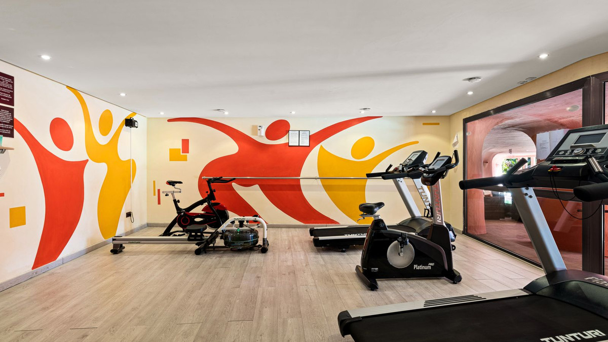 The apartment features a welcoming hallway, a fully fitted kitchen with an adjacent utility room, a master bedroom with an en-suite bathroom and direct access to one of the generous terraces, a guest bedroom with its own small balcony, and a guest bathroom. The spacious layout offers the potential to convert the property into a three-bedroom home, as other similar units in the complex have successfully done. Sold partially furnished, it also includes an underground garage space and a storage room.