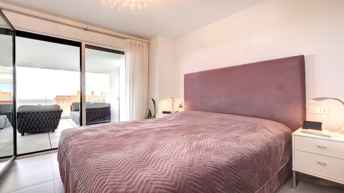 Tout droit, la cuisine ouverte, la salle à manger et le salon sont lumineux et modernes, donnant directement sur la grande terrasse, idéale pour dîner en plein air ou profiter des longs après-midi ensoleillés espagnols tout en profitant de la vue imprenable sur la mer.