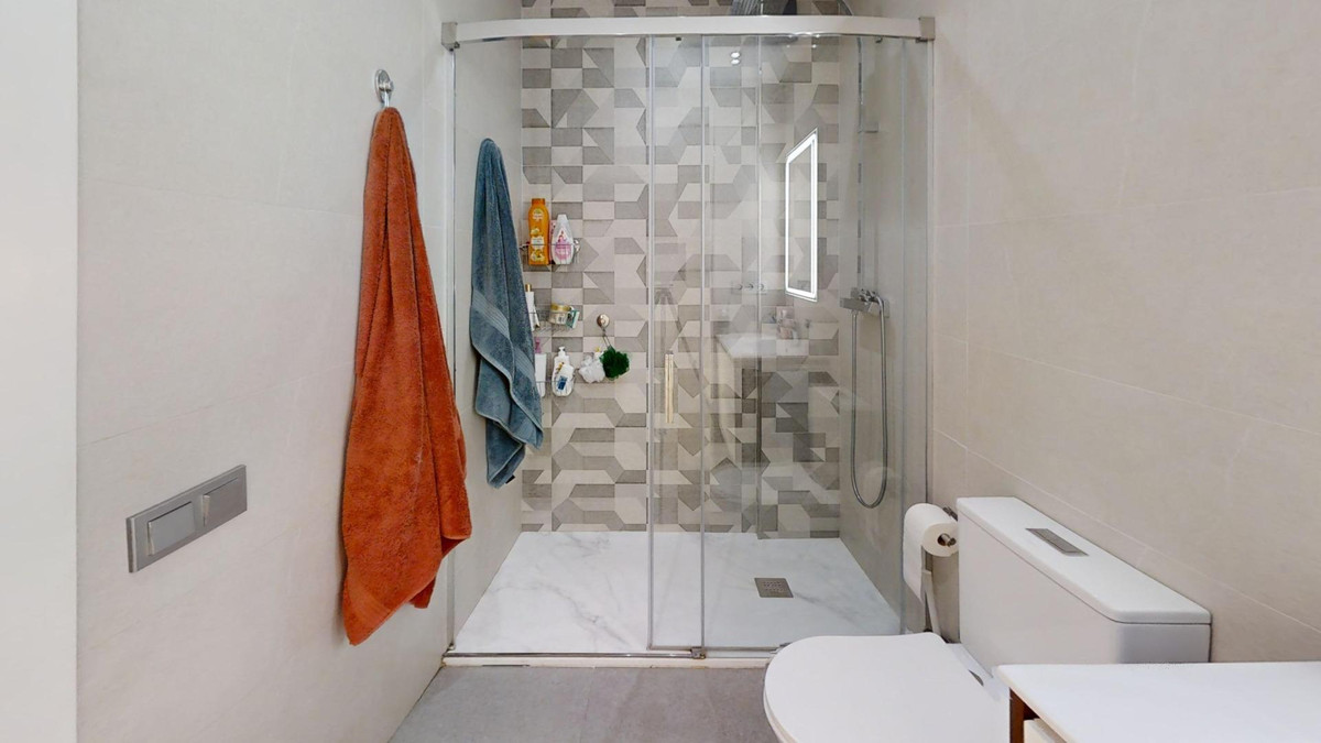 Salle de bain rénovée avec un receveur de douche moderne et des finitions de qualité supérieure.