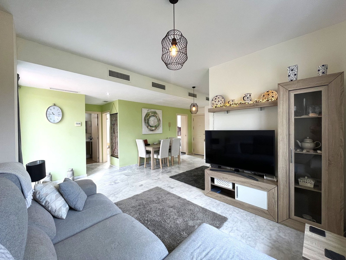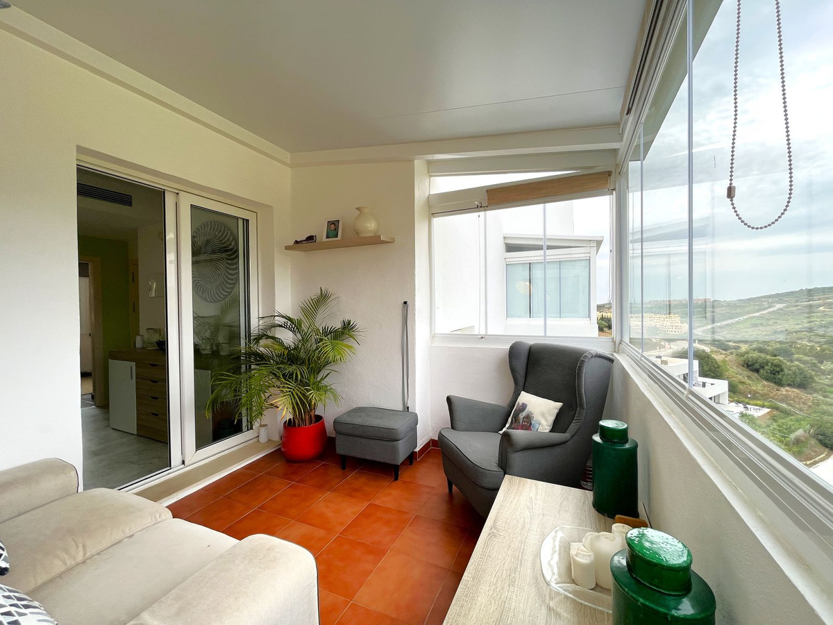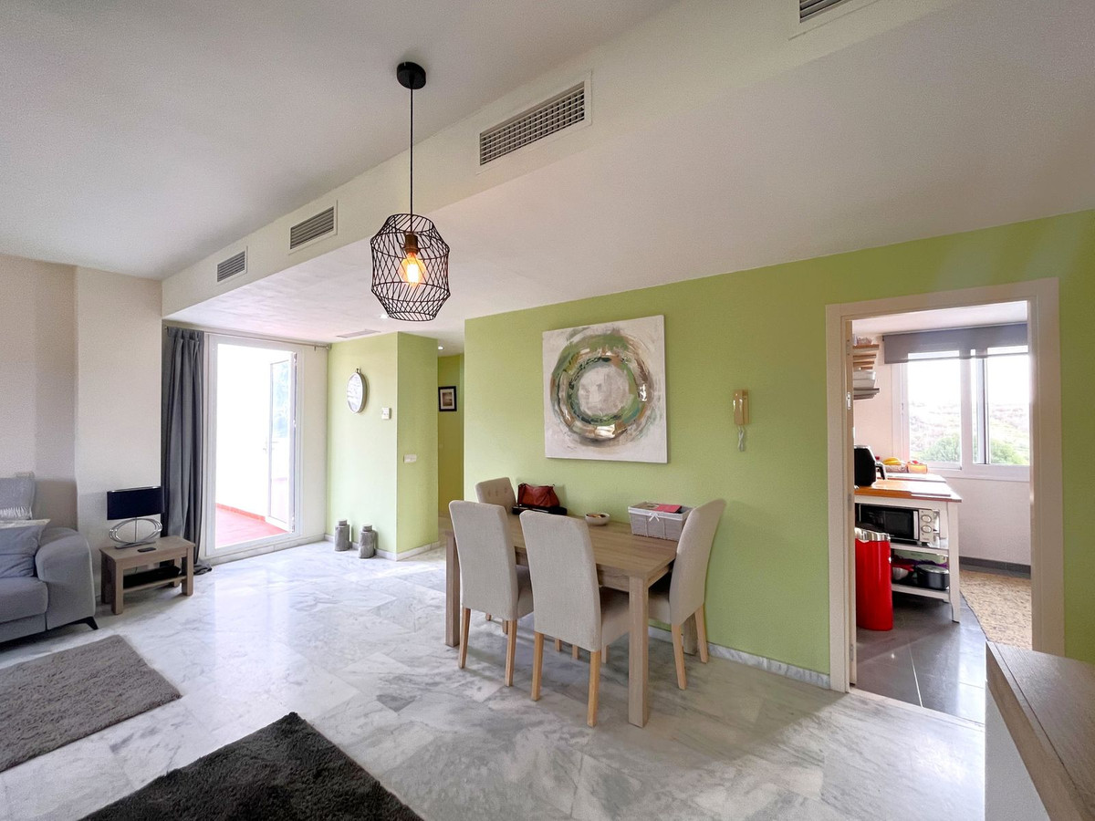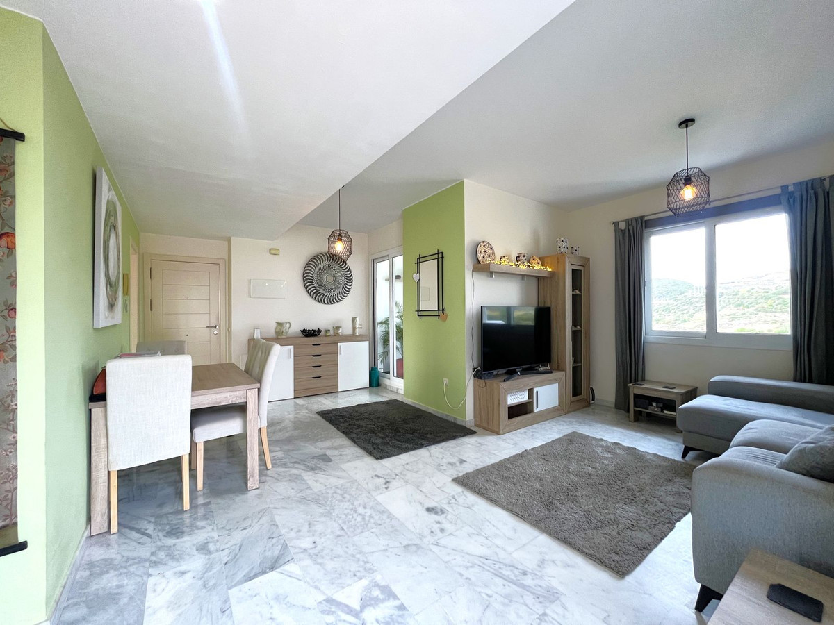 La propriété se distingue par sa grande terrasse panoramique offrant une vue imprenable sur le golf et les montagnes, l'endroit idéal pour profiter du soleil et de la tranquillité. Dès l'entrée, vous découvrirez un salon-salle à manger lumineux et spacieux donnant sur une terrasse vitrée avec rideaux coulissants, idéale comme espace de vie supplémentaire. La cuisine entièrement rénovée et équipée offre des finitions haut de gamme.