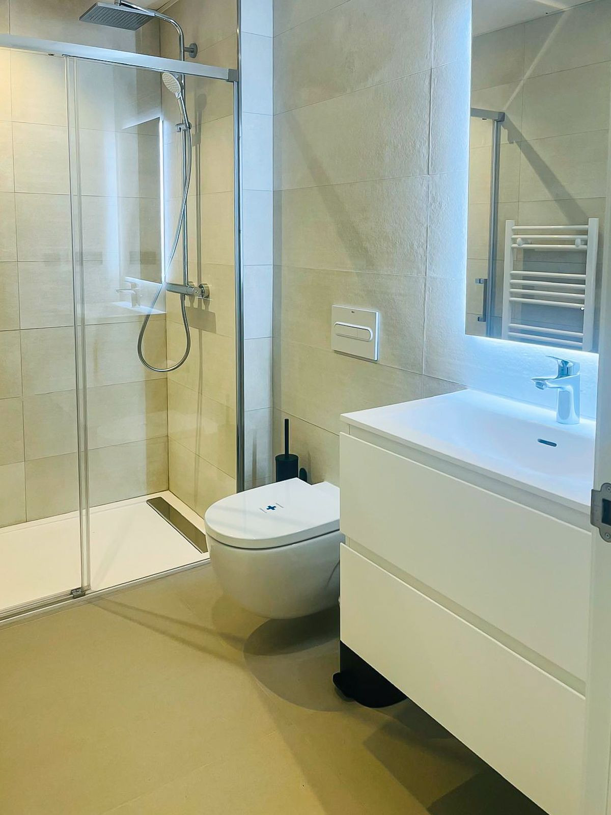 Offrant deux chambres et deux salles de bains, la chambre principale dispose d'une salle de bains ouverte avec douche à l'italienne, miroirs antibuée, sèche-serviettes électriques et placards supplémentaires. La cuisine ouverte entièrement équipée avec électroménager Bosch et un spacieux séjour/salle à manger sont également à votre disposition.