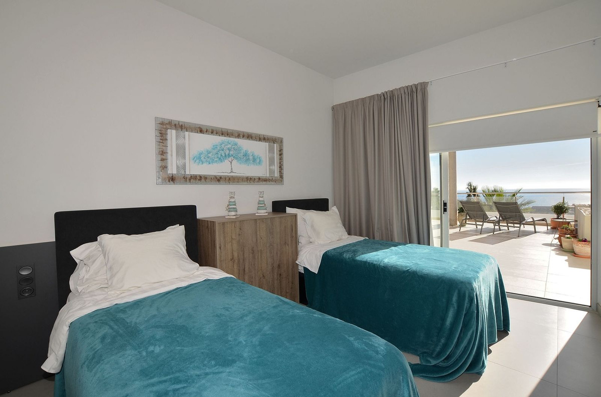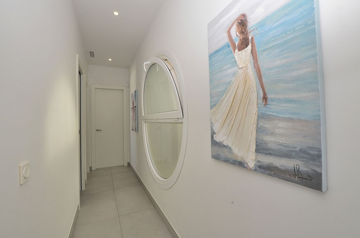 Entrée de la maison depuis la terrasse. Séjour, cuisine ouverte, couloir, buanderie, troisième chambre, salle de bains, deuxième chambre et suite parentale avec salle de bains attenante. Toutes les pièces ont accès à la terrasse.
