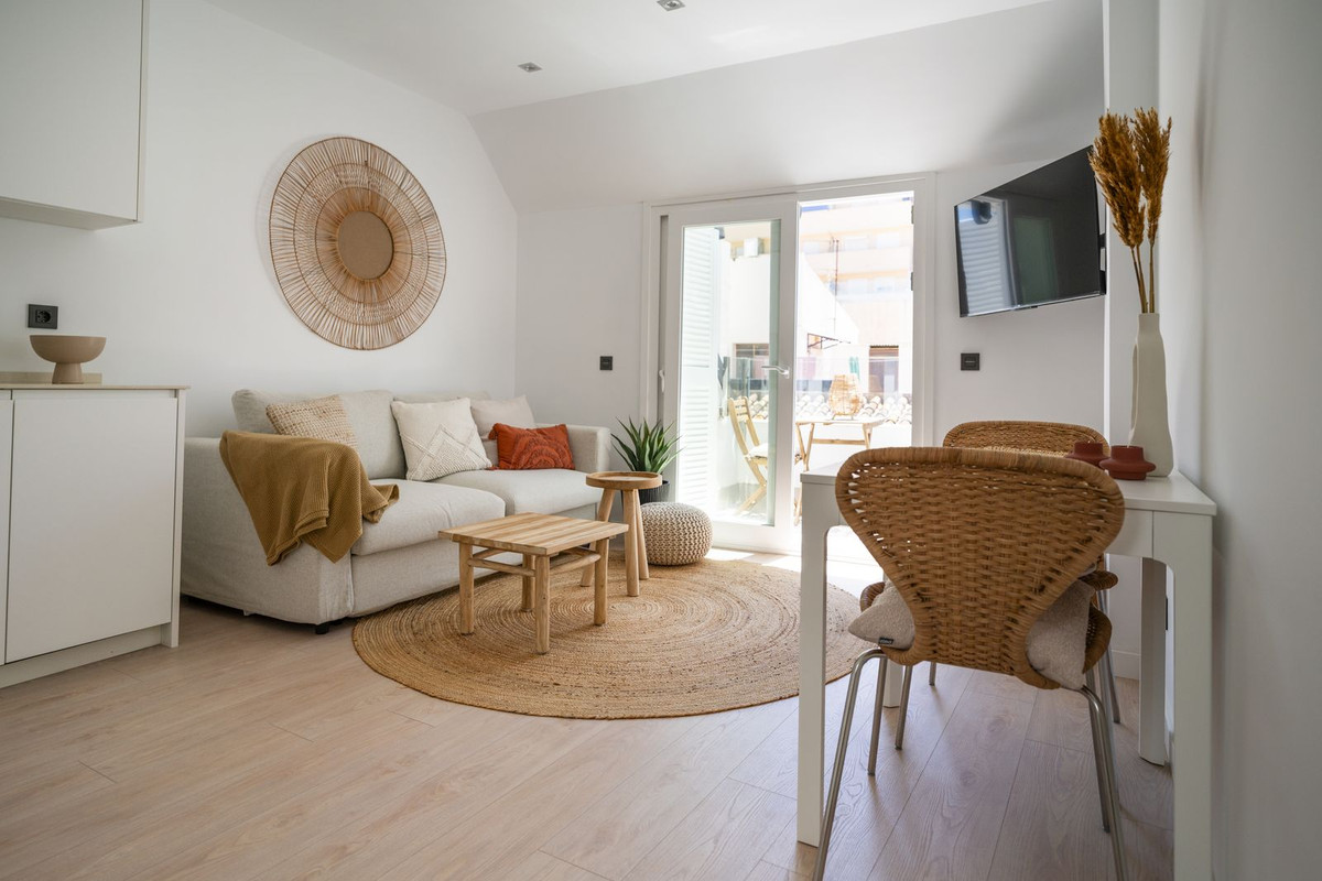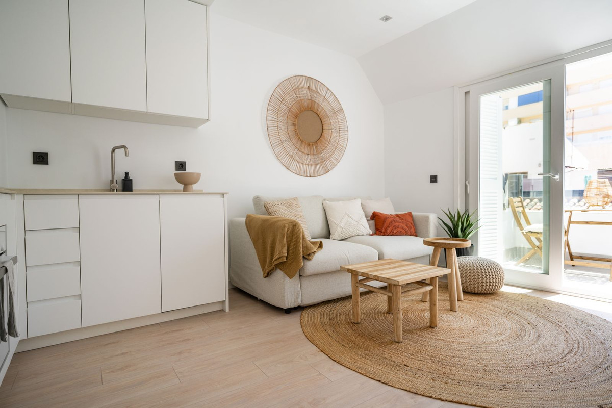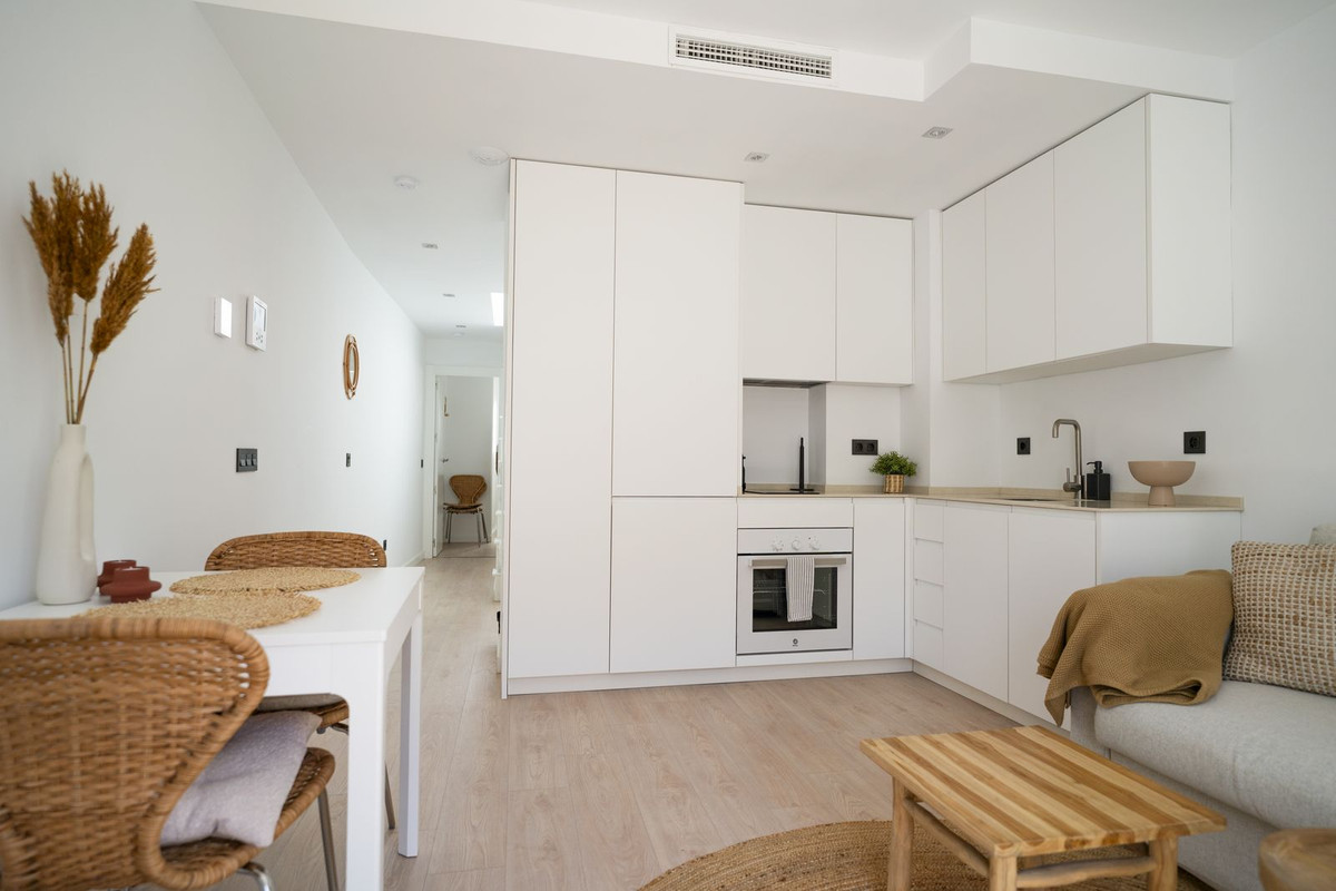 L'appartement dispose d'un séjour ouvert et d'une cuisine entièrement équipée et prête à l'emploi. Il comprend également une chambre paisible et une salle de bain moderne, créant ainsi un environnement harmonieux et confortable.