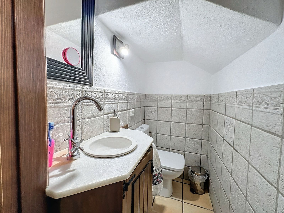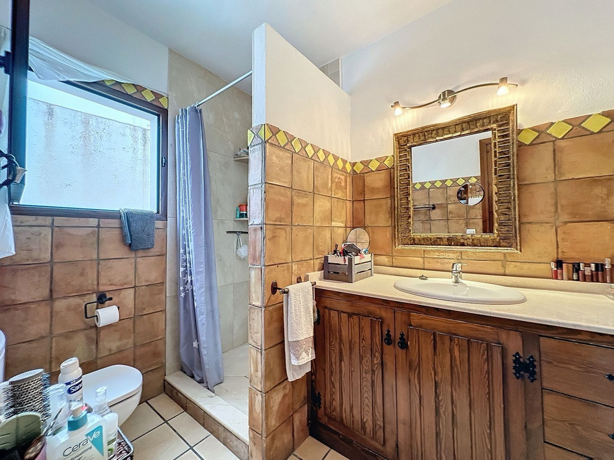 La salle de bain principale, spacieuse et lumineuse, s'intègre parfaitement au style rustique de la maison, avec des finitions de qualité qui renforcent la sensation de confort et d'harmonie.
