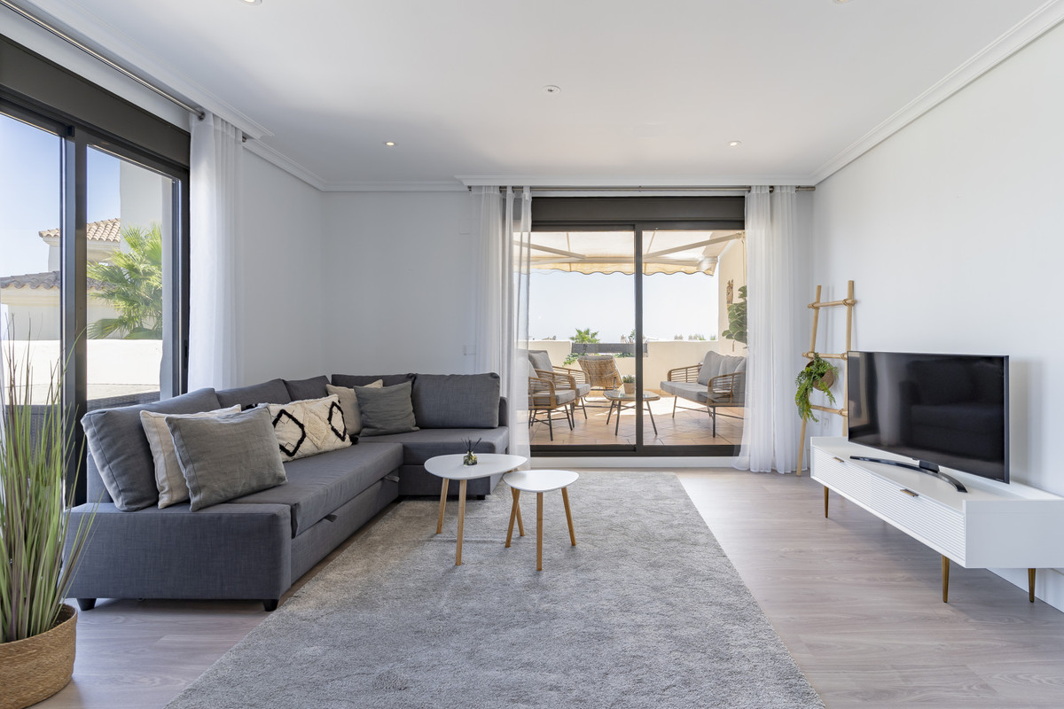 Bienvenue dans ce superbe appartement au premier étage, doté d'une spacieuse terrasse et d'un jacuzzi privé, situé dans une résidence sécurisée du quartier très prisé de Selwo à Estepona. Depuis la terrasse, vous profiterez chaque jour d'une vue panoramique imprenable sur la mer et les montagnes environnantes : idéal pour des moments de détente et des couchers de soleil inoubliables.