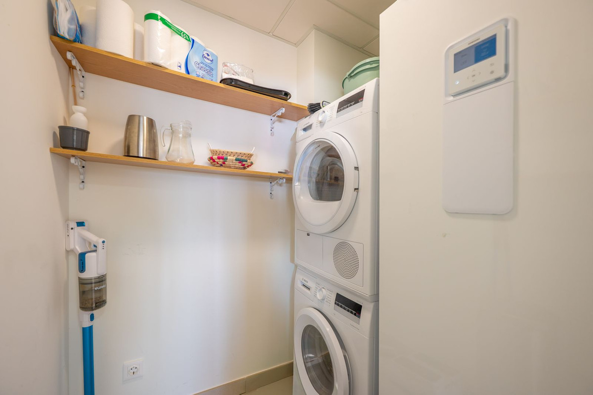 L'appartement dispose de deux chambres confortables. La chambre principale, de plus de 16 m², offre un espace de repos et un dressing pratique. La seconde chambre, de plus de 10 m², peut parfaitement servir de chambre d'amis, de bureau ou de chambre d'enfants. Les deux salles de bains ont été soigneusement conçues et réalisées avec des matériaux de haute qualité. Une buanderie séparée, un atout supplémentaire, contribue à l'organisation des pièces à vivre.