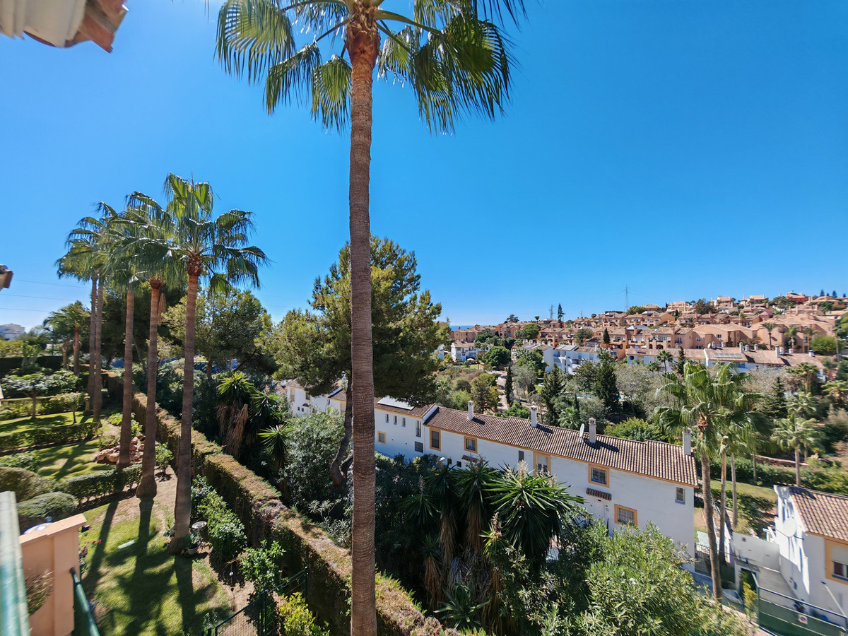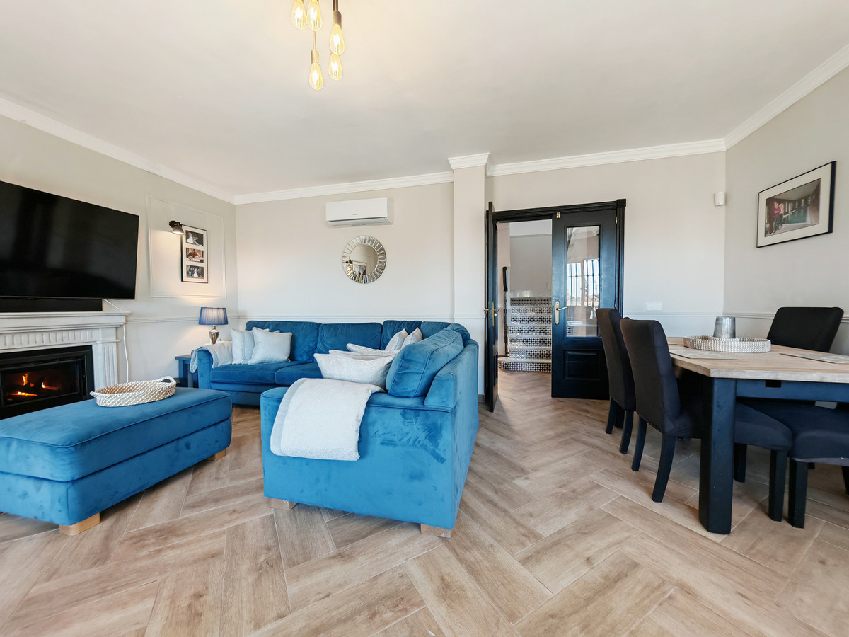 Semi Detached House for sale in , Mijas Costa with 3 bedrooms, 3 bathrooms and with orientation south/west, with communal swimming pool, private garage (1 parking spaces) and private garden. Regarding property dimensions, it has 139 m² built and 27 m² terrace. Has the following facilities amenities near, transport near, air conditioning, fully fitted kitchen, utility room, fireplace, guest room, storage room, alarm, dining room, private terrace, kitchen equipped, living room, golf view, laundry room, internet - wi-fi, covered terrace, fitted wardrobes, gated community, unfurnished, close to children playground, close to sea / beach, close to golf, uncovered terrace, balcony, good condition, urban view, close to shops, close to town and close to schools.
