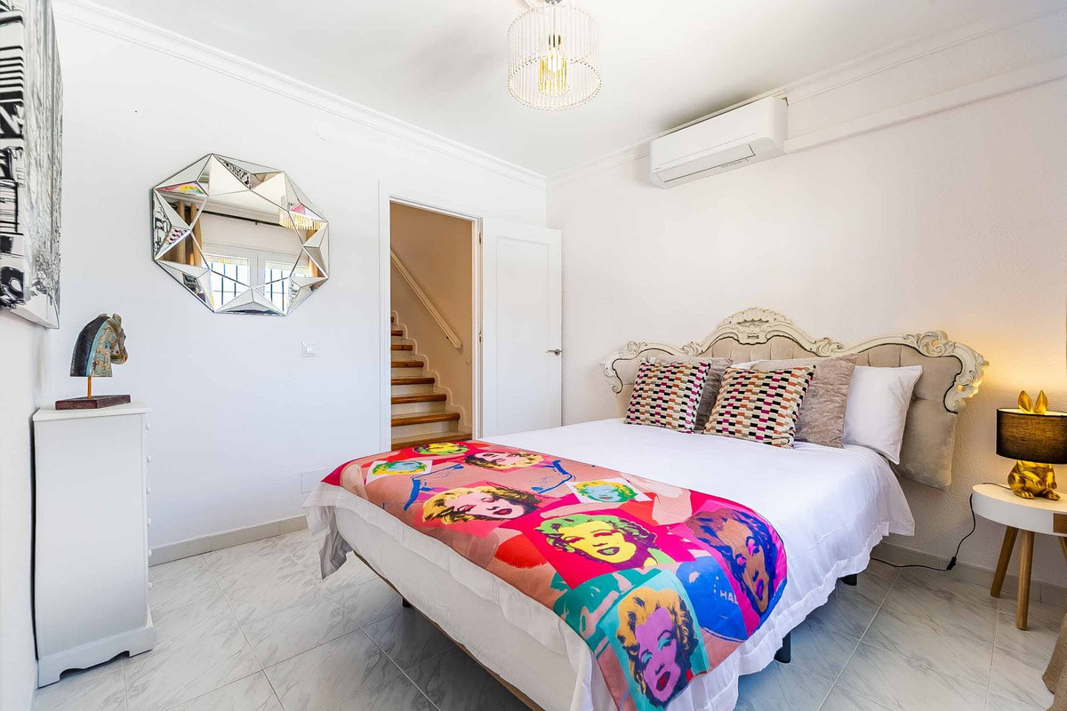 We are pleased to present this marvellous 4 bedroom 3.5 bathroom detached villa in the classic Andalucian style, constructed in 1988 & recently renovated to the highest standards. The property boasts mature gardens with both covered & open seating & dining areas, as well as a dedicated barbecue area, perfect for enjoying the wonderful climate and the sea & mountain views. The location is excellent, being a 5 minute drive from the beaches & Benalmadena Pueblo. The villa has parking for at least 4 cars, a large private pool, a solarium with magnificent views & 2 seating areas, bar, barbecue area, storage sheds, & trampoline. Entering on the upper level through the hall, we find an ample lounge with fireplace with access to the covered terrace, kitchen, dining room, & guest toilet. On the lower level there are 4 double bedrooms & 3 bathrooms, 2 of which are ensuite, & 2 with access to the pool and gardens.