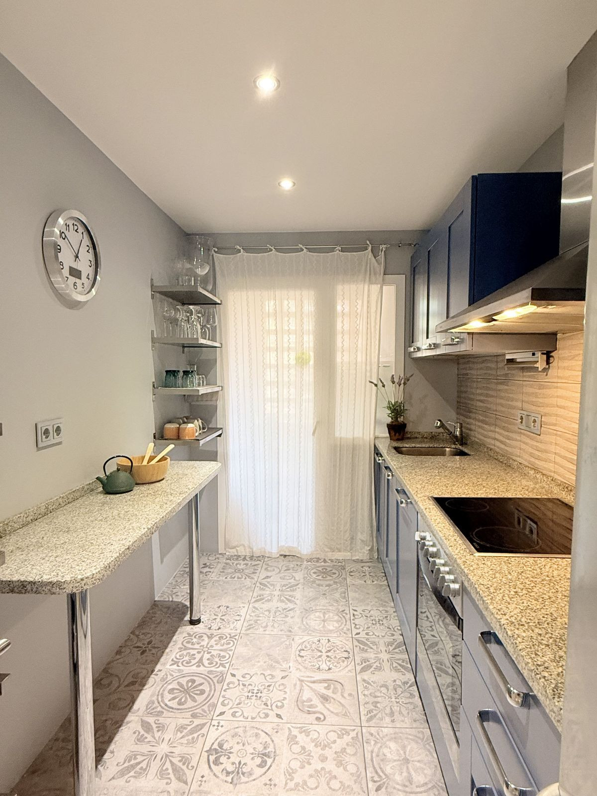 La belle cuisine américaine, de style « Gallery », est ornée d'armoires de style Shaker bleu et d'un carrelage décoratif. Elle est complétée par une buanderie séparée et des rangements supplémentaires. Une place de parking est incluse.