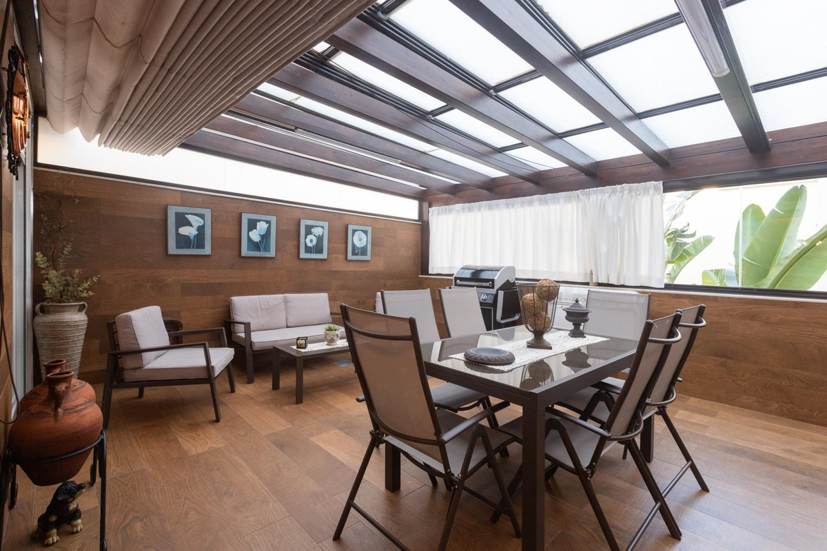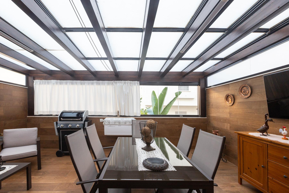 The master bedroom has access to the terrace, the bathroom is renovated, and there is another bedroom with a comfortable dressing room. The living room connects to a glazed terrace, perfect for year-round use; it even has air conditioning! And it comes with a garage and storage room included in the price.