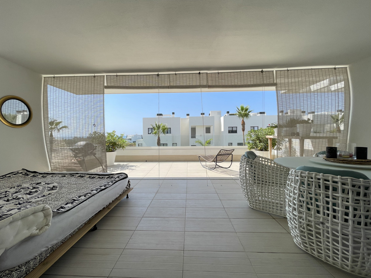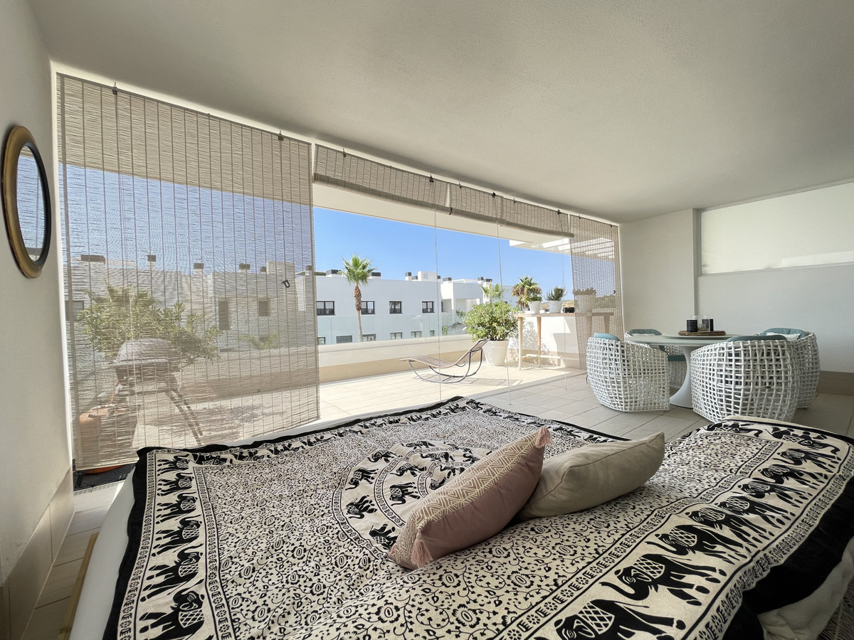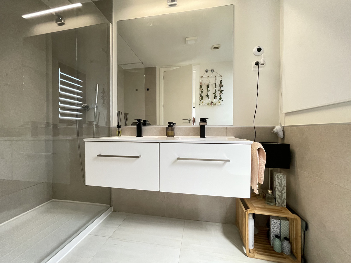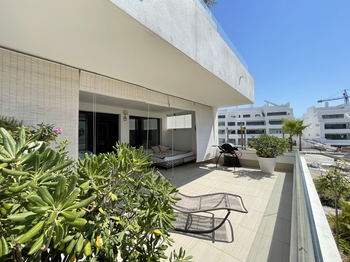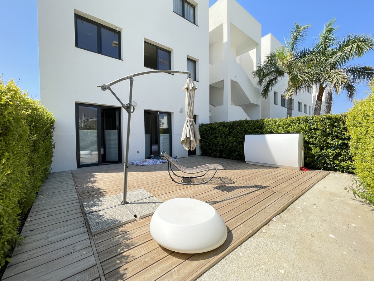 Il dispose de deux chambres et de deux salles de bains, idéal pour les familles et les couples privilégiant l'espace et la fonctionnalité. L'appartement dispose d'une terrasse privée de 45 m² et d'un patio de 45 m² au rez-de-chaussée, parfaits pour profiter du climat méditerranéen, du soleil et d'une vue partielle sur la mer. La propriété dispose d'une cuisine ouverte entièrement équipée, d'une buanderie séparée, de la climatisation et de placards intégrés optimisant l'espace.