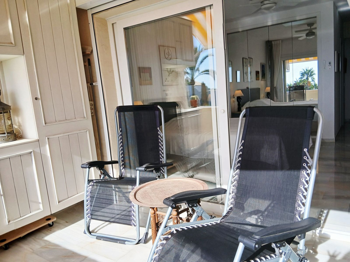 The apartment offers two spacious bedrooms, both with fitted wardrobes and ceiling fans. The master bedroom, with its en-suite bathroom, opens onto a private terrace with storage and uninterrupted sea views.