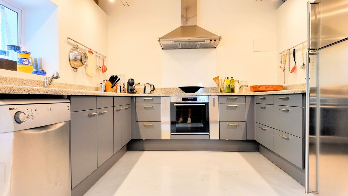 The spacious living room with fireplace and large windows offers lots of light and a warm, inviting atmosphere. The large, fully fitted U-shaped kitchen with high ceilings connects to a practical utility room with an extra fridge, washing machine, and dryer.