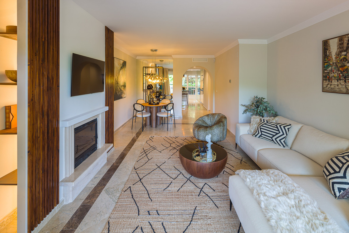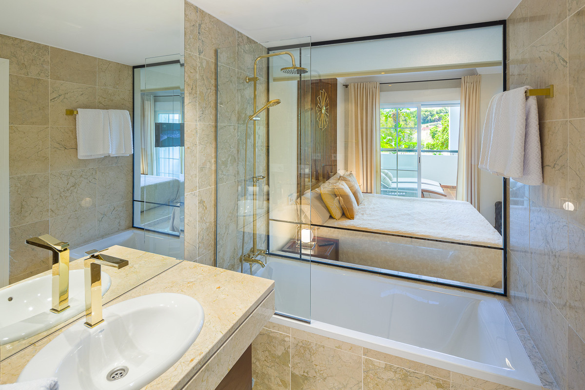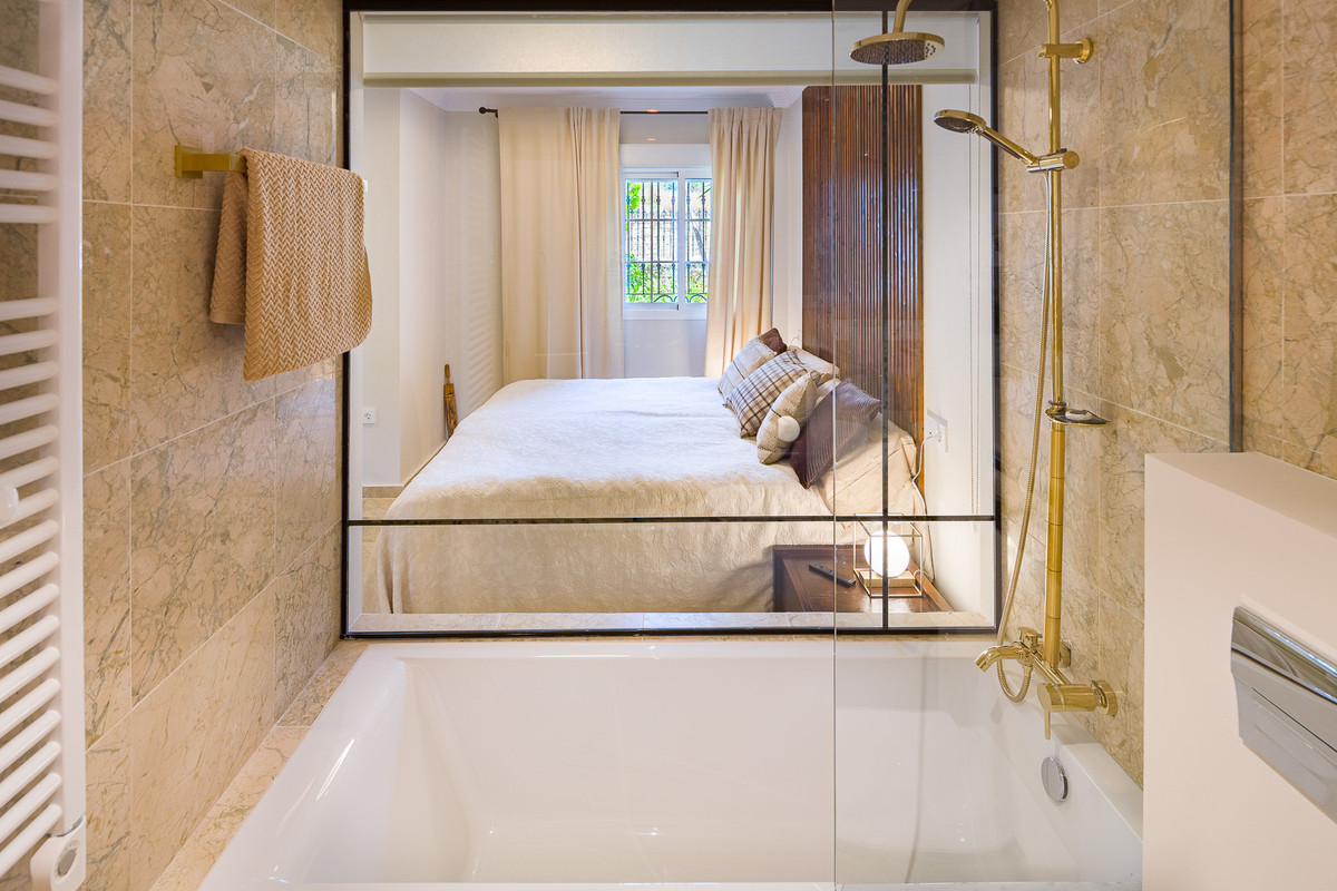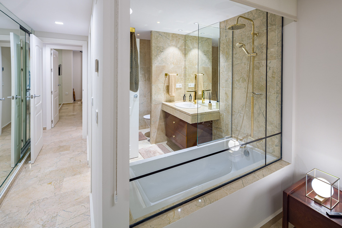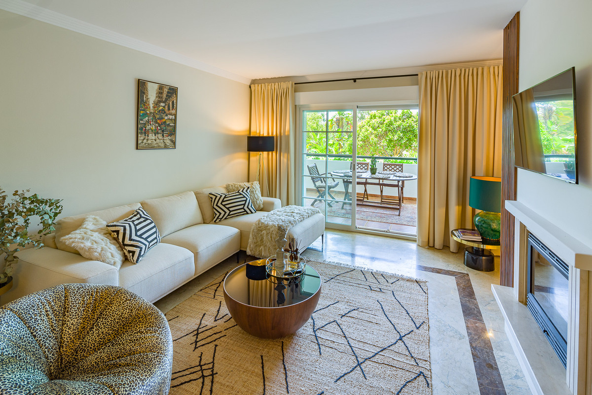 Newly renovated Luxury design, cozy apartment in prestigious Marbella Golden Mile urbanization "Balcon de Puente Romano", next to “Puente Romano Nobu”, “Marbella Club”, the beach and sea - 3-5 min walking distance. Bright and spacious apartment with a brand-new furniture and top-quality equipment, 2 modern bedrooms, 2 bathrooms, 2 big terraces, HD TV in each room, air conditioner with 3 different climate zones, 24 h access to newly renovated swimming pool. For your comfort and luxury living in tropic garden surround. Private underground parking is included.