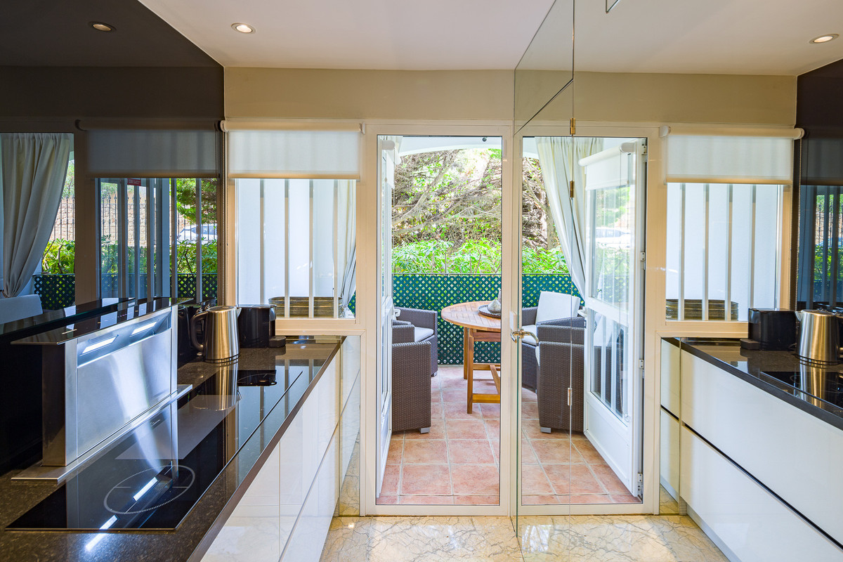 Access from the living room to a big terrace with table for 7-8 persons and 2 comfortable sunbeds, swimming pool and tropical garden view.