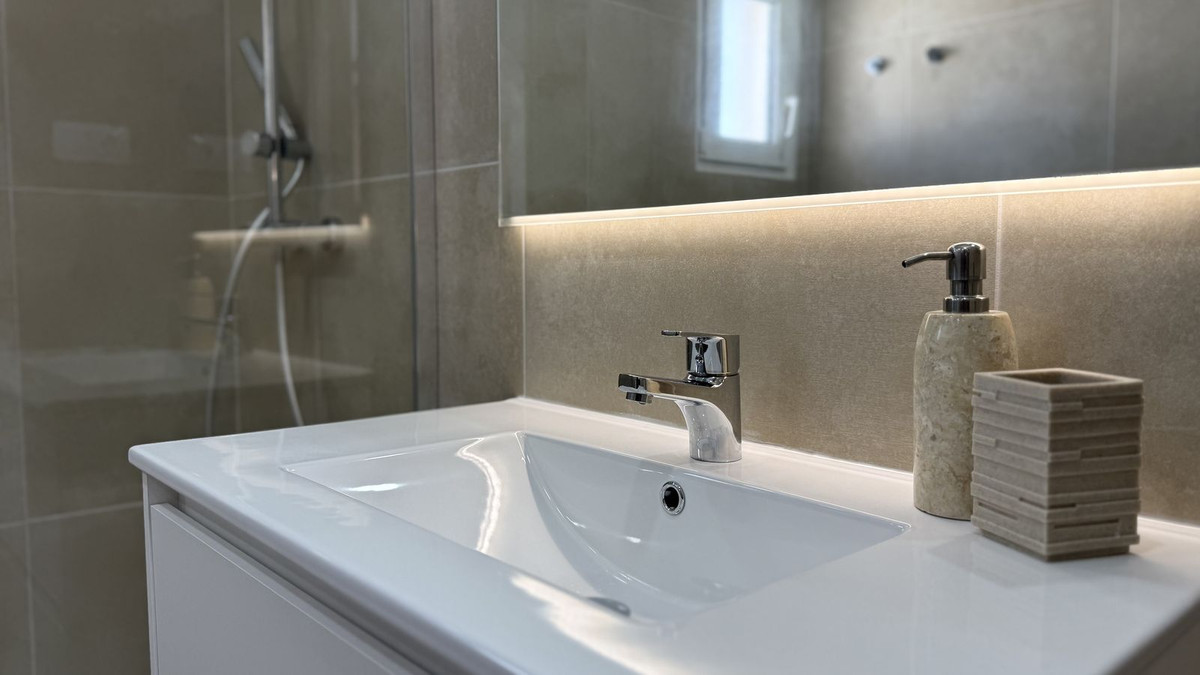 The apartment features a bright and modern open-plan layout connecting the newly renovated kitchen with the living room – perfect for social gatherings and relaxation.