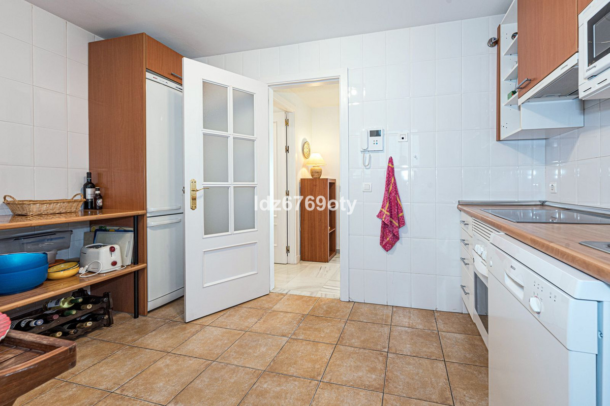 The 3-bedroom apartment, which is in excellent condition has a living area of 120m2, faces south-west and is located on the 1st floor. Through the main entrance there is a wheelchair lift to the normal lift which takes you to both the different floors and the indoor garage. The flat is therefore easily accessible for wheelchairs. The neutrally decorated flat is fully furnished, equipped with air conditioning/heating and has fast Wi-Fi. The open and spacious kitchen offers various built-in appliances, including a dishwasher, oven, microwave, fridge/freezer and a ceramic hob. From the kitchen you have access to a private patio of 35m2 wich can be used in many ways. From the dining/living room with a cosy fireplace there is direct access to the spacious terrace of 40m2 with sea views and space for both various sun loungers and a dining area for 6 people. The spacious master bedroom has fitted wardrobes and direct access to the terrace. The en-suite bathroom has double sinks, a bath/shower and a toilet. The second bedroom has fitted wardrobes and also access to the terrace and, together with the third bedroom, shares a separate second bathroom with a bath/shower and a toilet. The flat also has a laundry area with a washing machine and a dryer. In the underground car park, there is a personal storage room and 2 private parking spaces.