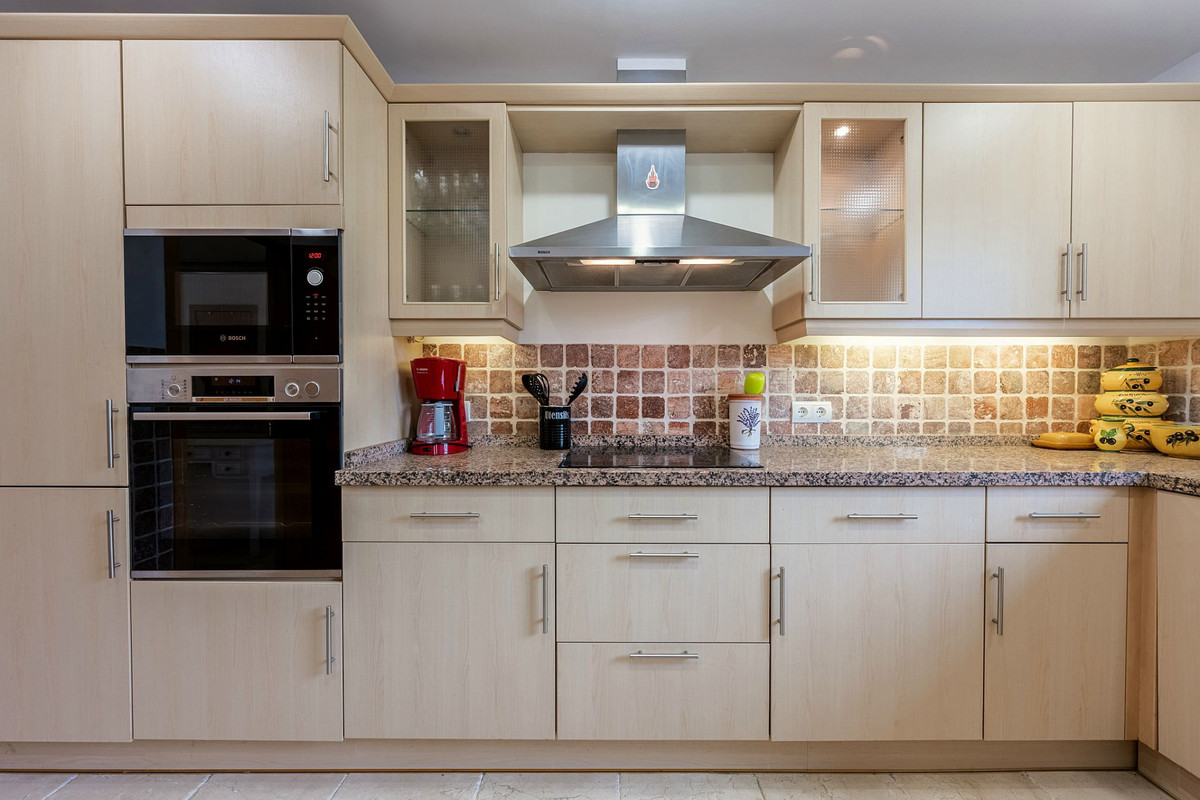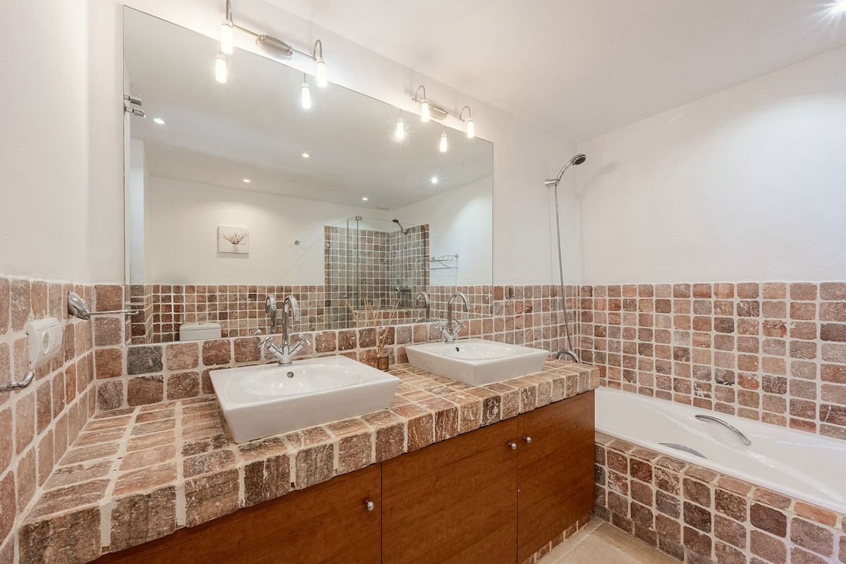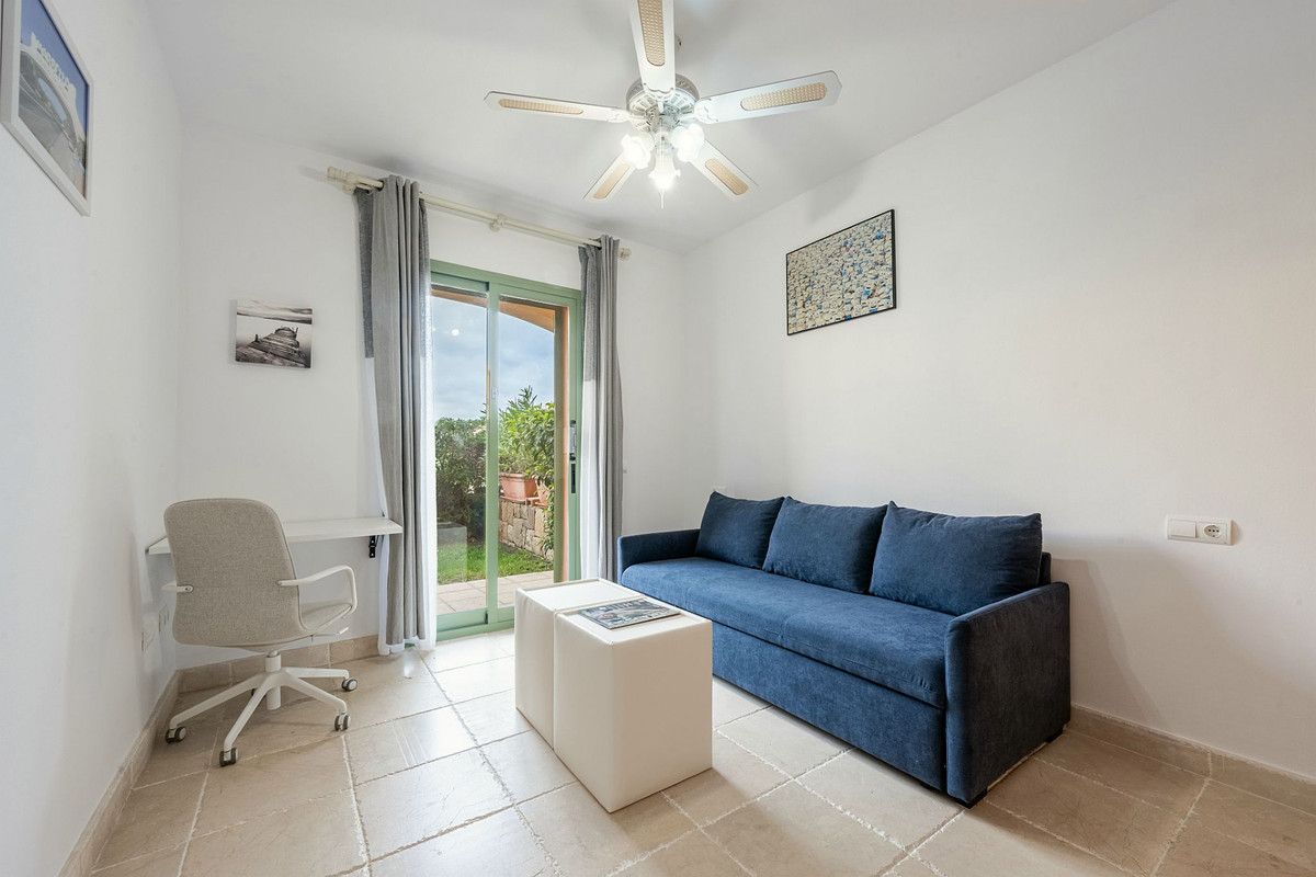 Outside, the cozy covered terrace is ideal to enjoy the Mediterranean climate year-round. From the private garden, you can access one of the three community pools directly — a feature that adds both convenience and exclusivity.