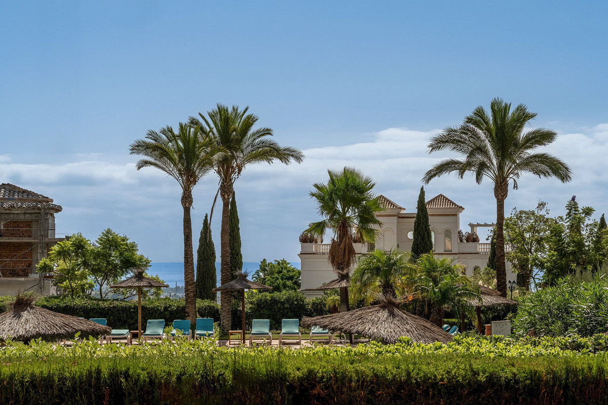 The property boasts a 50 m² private garden with direct access to the main pool, offering beautiful views of the sea and lush communal gardens. The gated community features 24-hour security, three swimming pools, and landscaped green areas, providing a safe and relaxing environment.