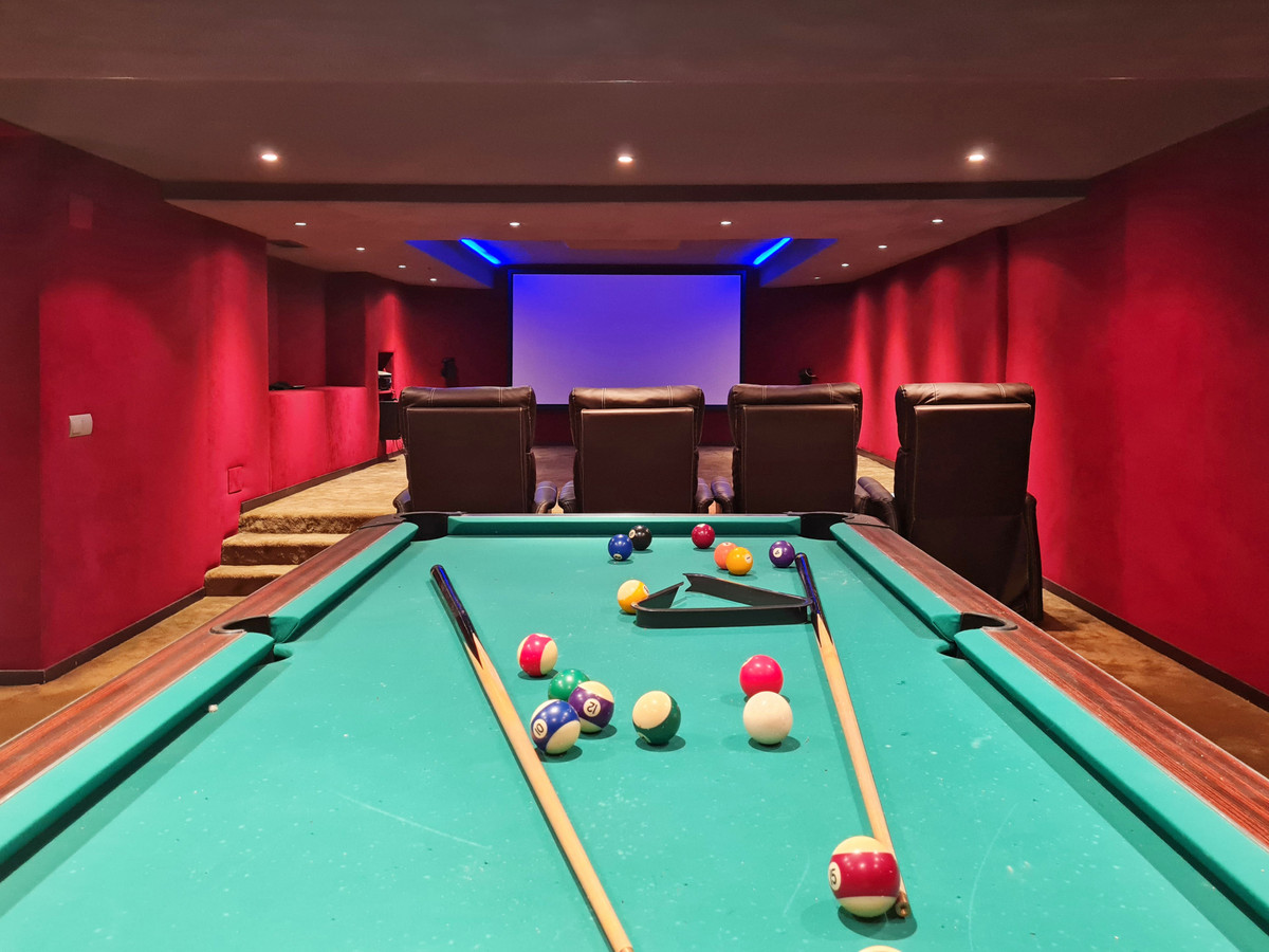 The lower level offers two additional bedrooms and an entertainment area with a home cinema. Outside, the lush garden is a private oasis, featuring a stunning pool with a sun deck, and ample space for relaxation.