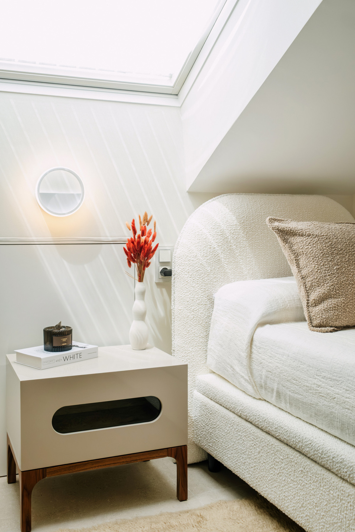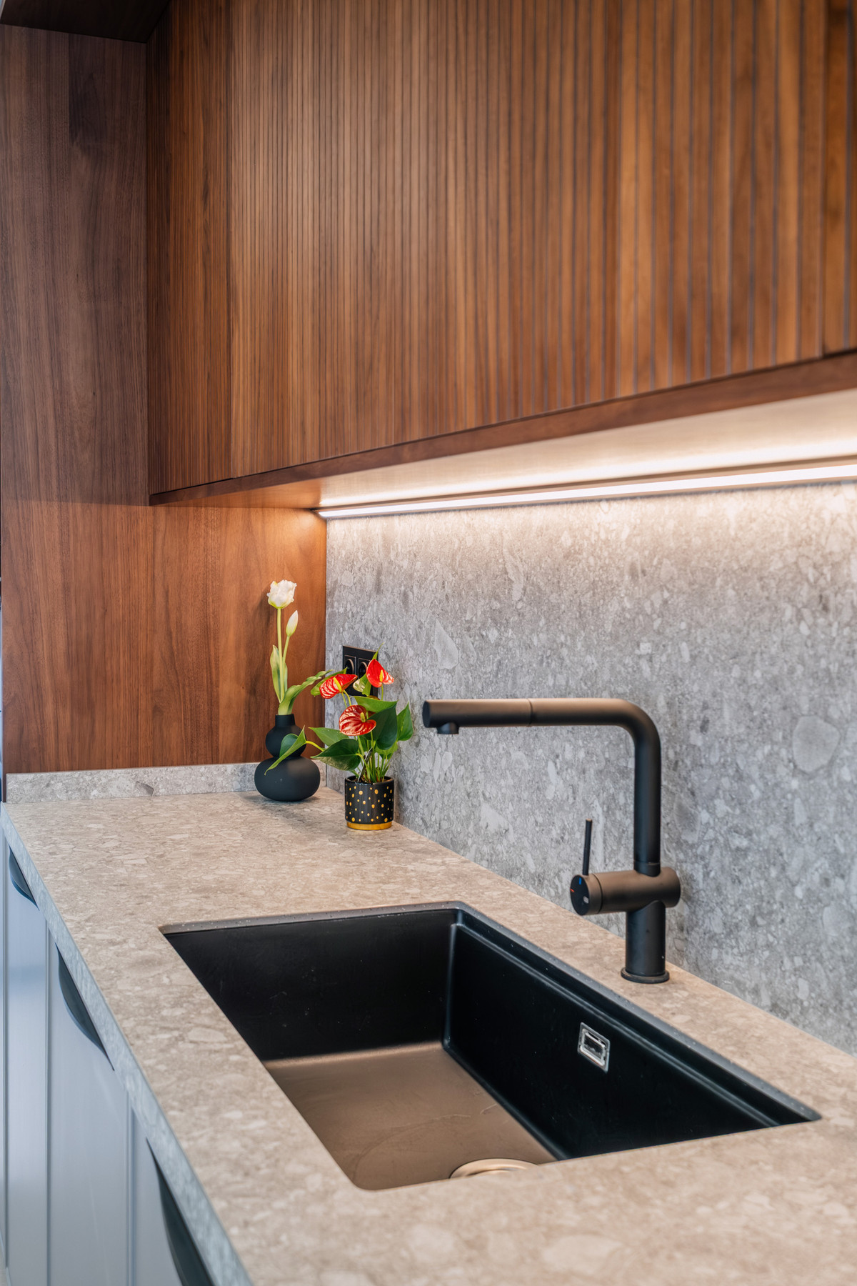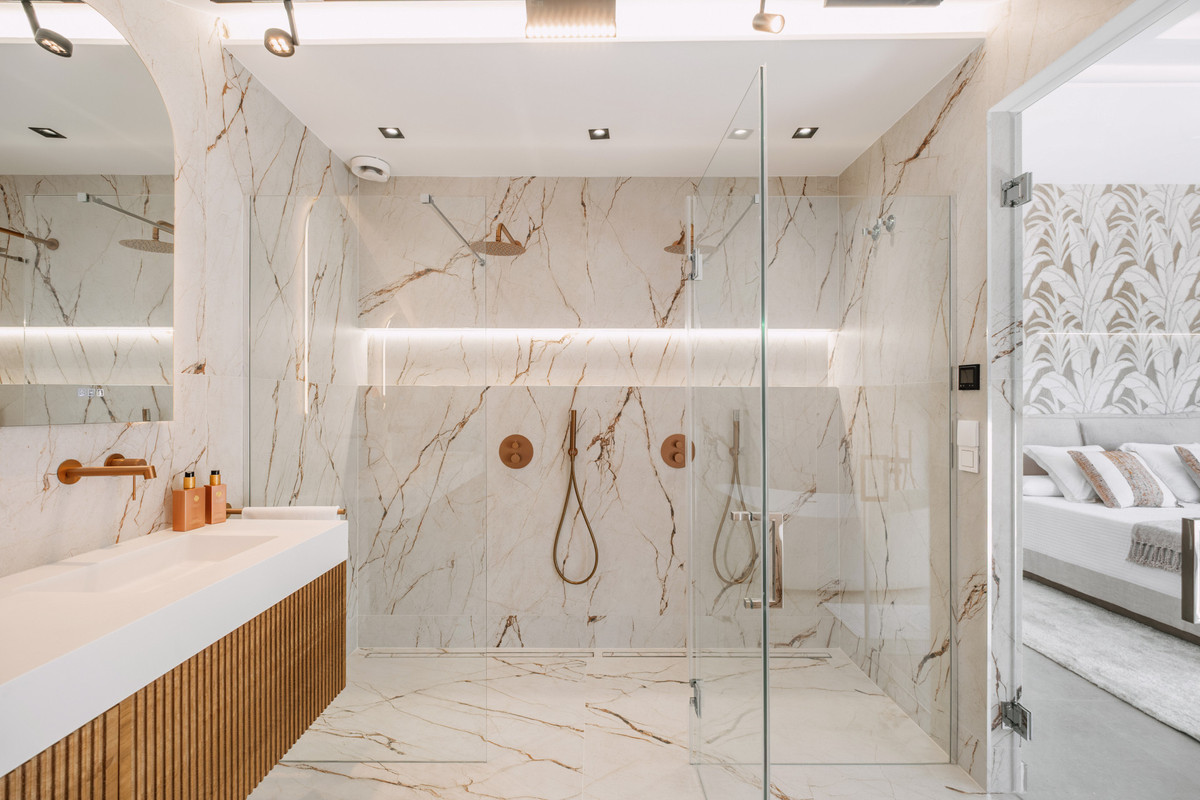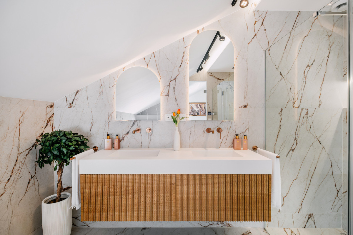 La rénovation, achevée en 2025, allie matériaux naturels, détails en noyer et éclairage chaleureux pour créer un intérieur moderne et apaisant. Le rez-de-chaussée comprend un espace de vie ouvert avec salle à manger et cuisine entièrement équipée, incluant des appareils Siemens, un îlot central en pierre, un réfrigérateur double, une cave à vin intégrée et un office séparé.