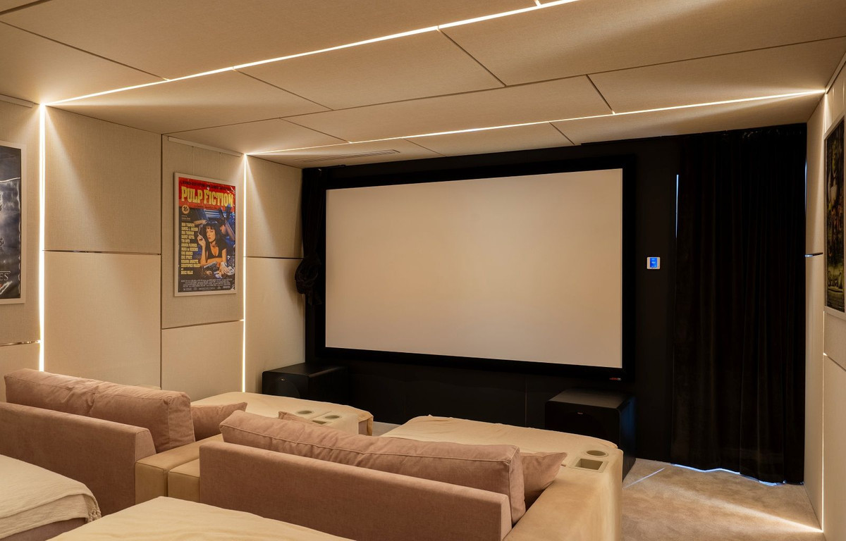 Le niveau inférieur de la villa abrite une quatrième chambre avec salle de bains, ainsi que de nombreux espaces de loisirs : salle de jeux, cave à vin impressionnante, salle de cinéma et salle de sport entièrement équipée. Un ascenseur privé dessert les trois niveaux de la maison pour un confort optimal.