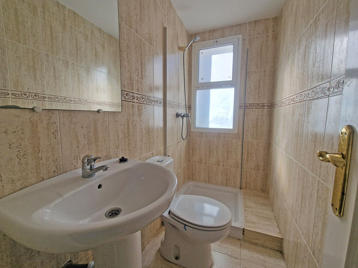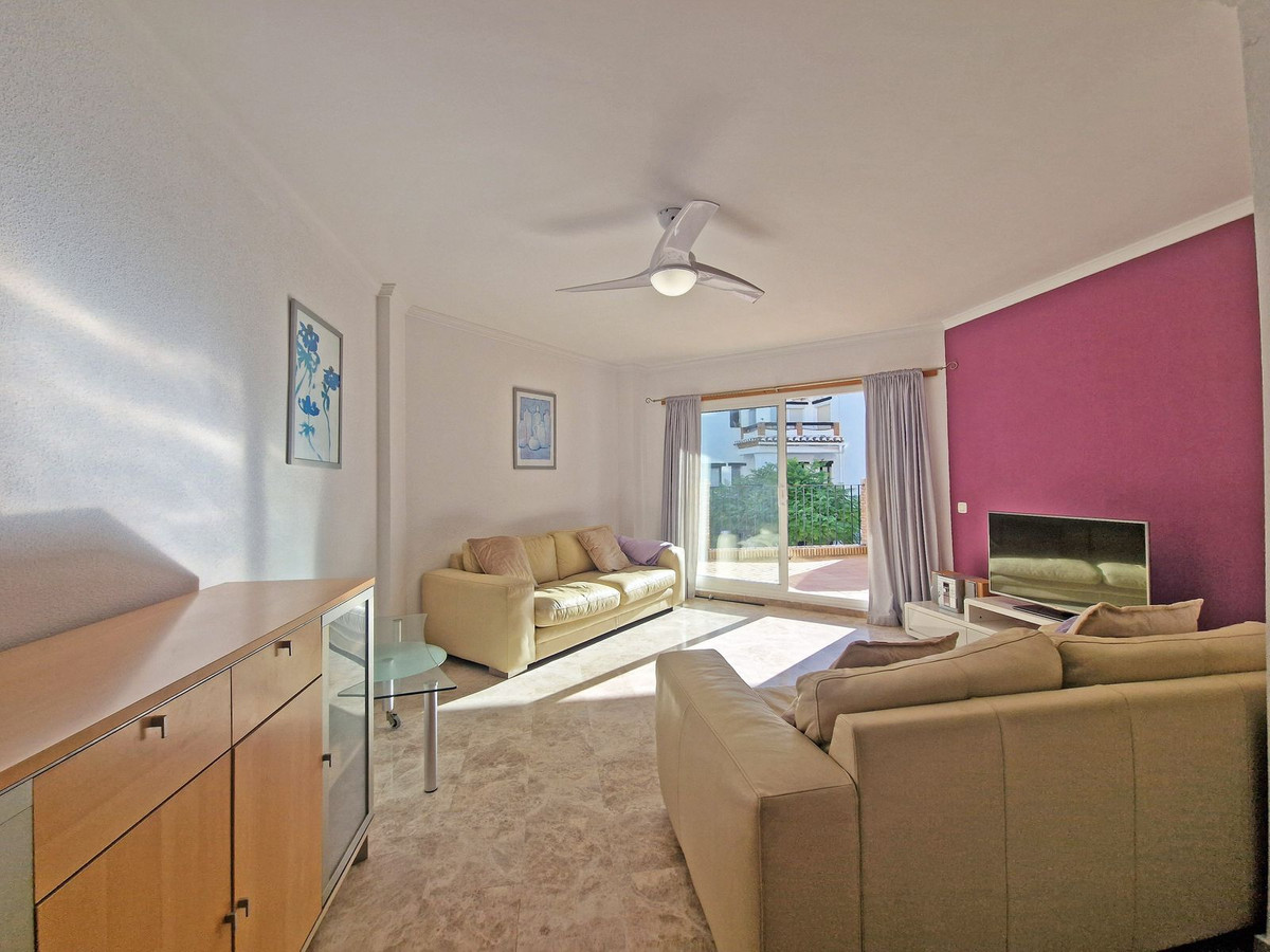 À l'intérieur, l'appartement se distingue par son élégant sol en marbre crème et sa grande cuisine semi-ouverte entièrement équipée. Il comprend deux chambres lumineuses et confortables, chacune dotée d'un placard intégré, et deux salles de bains, dont une attenante. La chambre principale et le salon donnent directement sur la terrasse, créant ainsi une belle continuité entre les espaces de vie intérieurs et extérieurs.