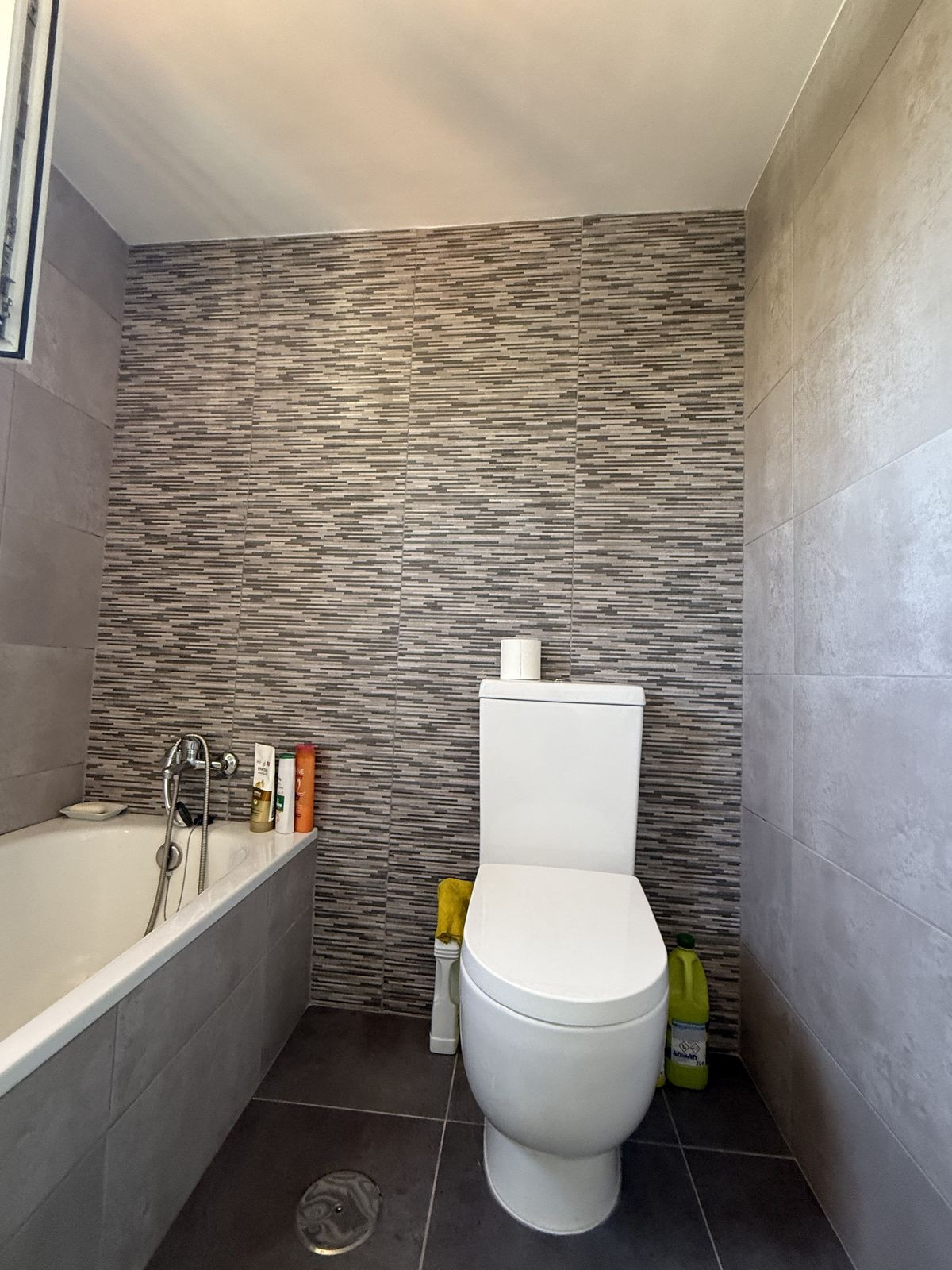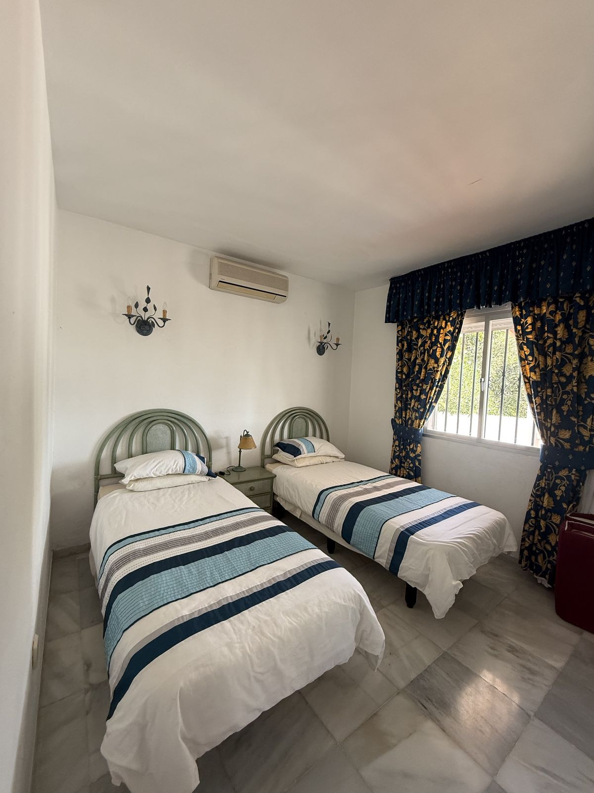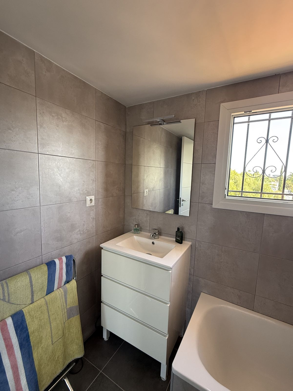 Au rez-de-chaussée, vous trouverez une cuisine ouverte sur le séjour et la salle à manger, donnant sur une terrasse couverte très privée, idéale pour les douces soirées d'été. Depuis la salle à manger, un couloir mène à la chambre d'amis et à sa salle de bains avec baignoire. La chambre d'amis est une chambre double spacieuse (actuellement aménagée avec deux lits simples) dotée de placards intégrés et de la climatisation.