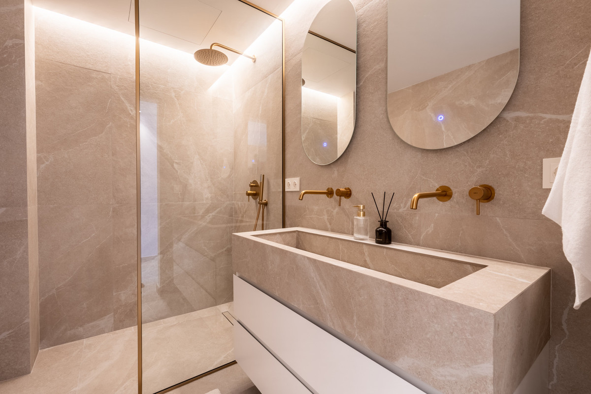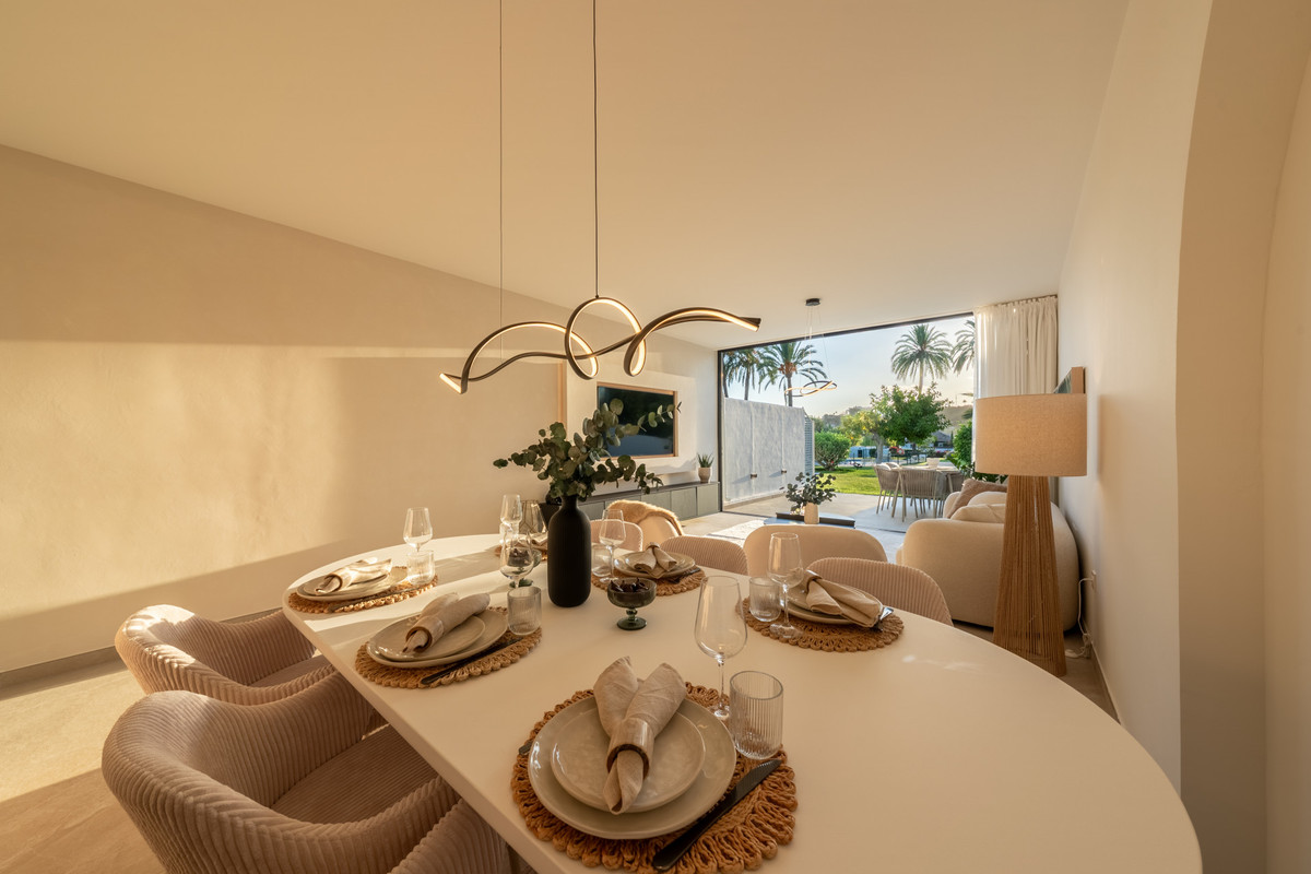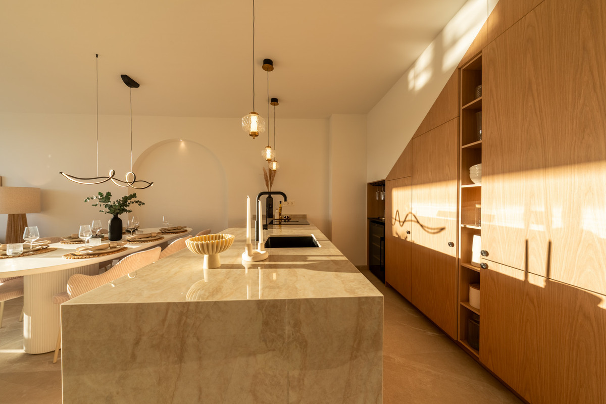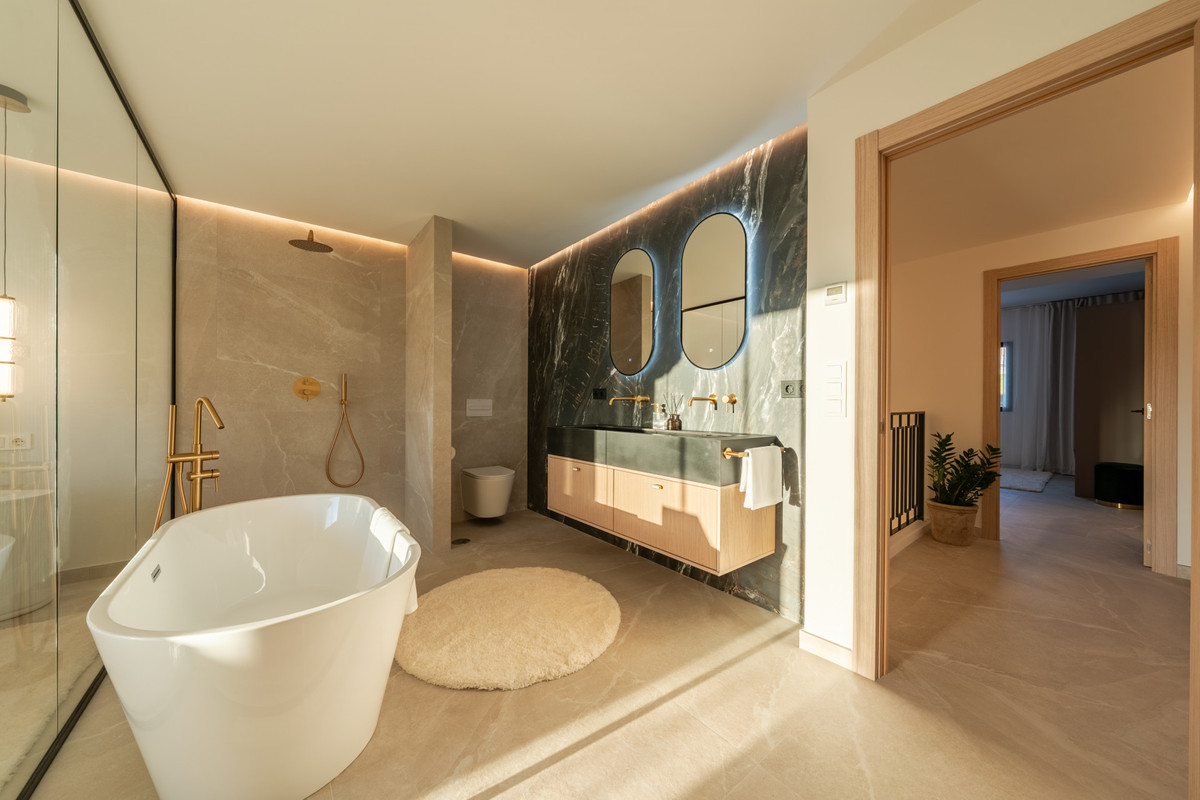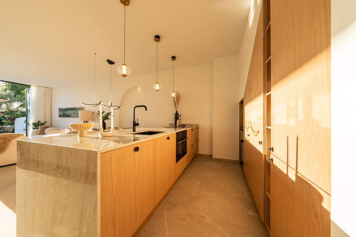 Conçue dans un style méditerranéen moderne, cette maison dégage chaleur et élégance. L'espace de vie ouvert comprend une cuisine sur mesure aux accents de bois naturel et aux finitions Dekton, qui se prolonge harmonieusement vers la salle à manger et le salon. De larges portes vitrées s'ouvrent sur une terrasse privée et un jardin paysager, idéal pour profiter pleinement de la vie en plein air.