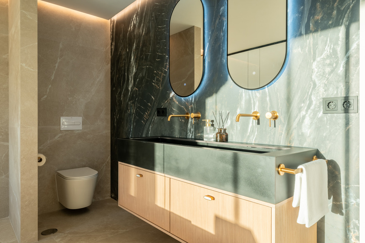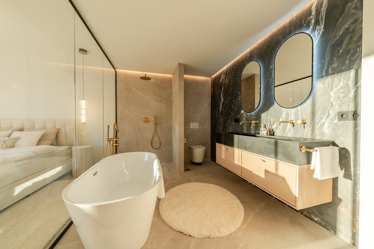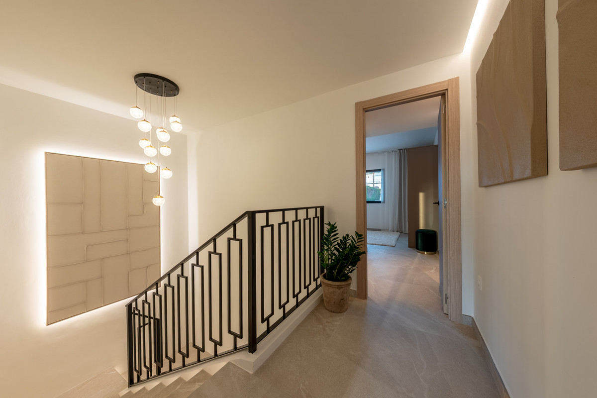 À l'étage, la suite parentale sereine et les chambres d'amis allient confort et style, sublimés par des matériaux raffinés et des tons doux et neutres.