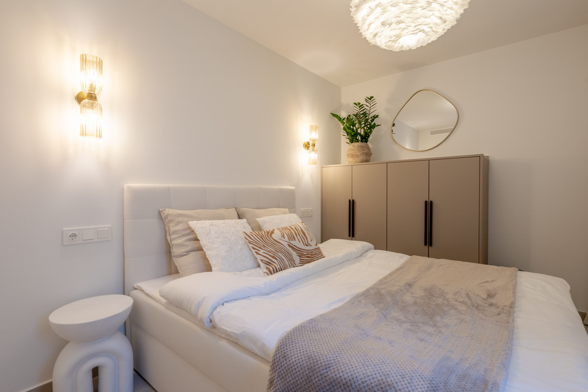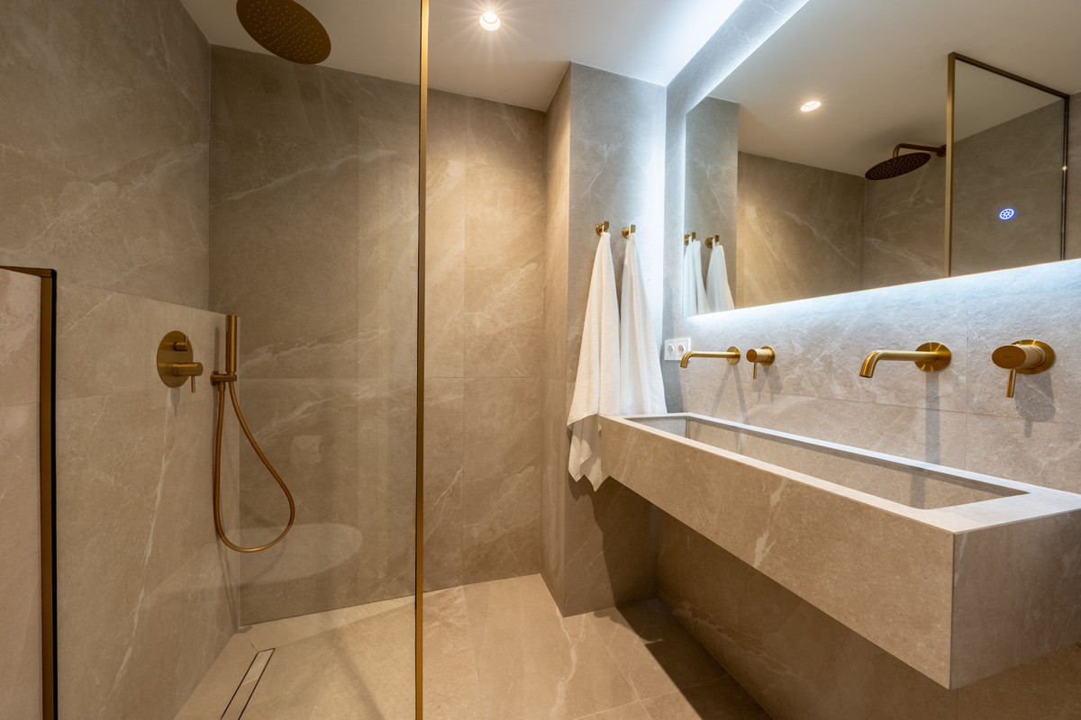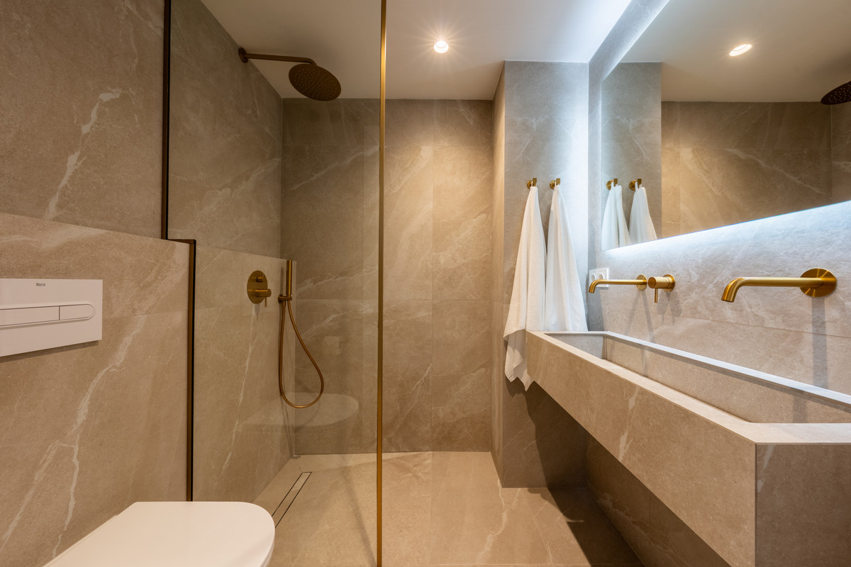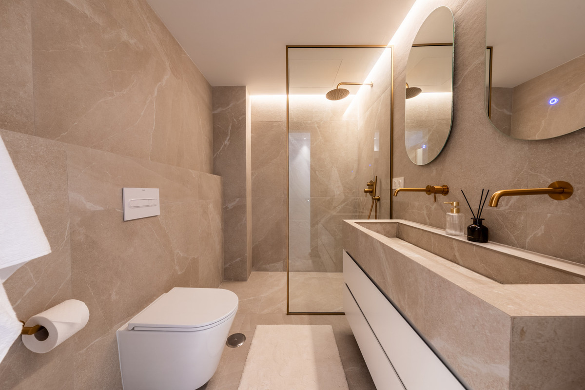 À l'étage, la suite parentale sereine et les chambres d'amis allient confort et style, sublimés par des matériaux raffinés et des tons doux et neutres.