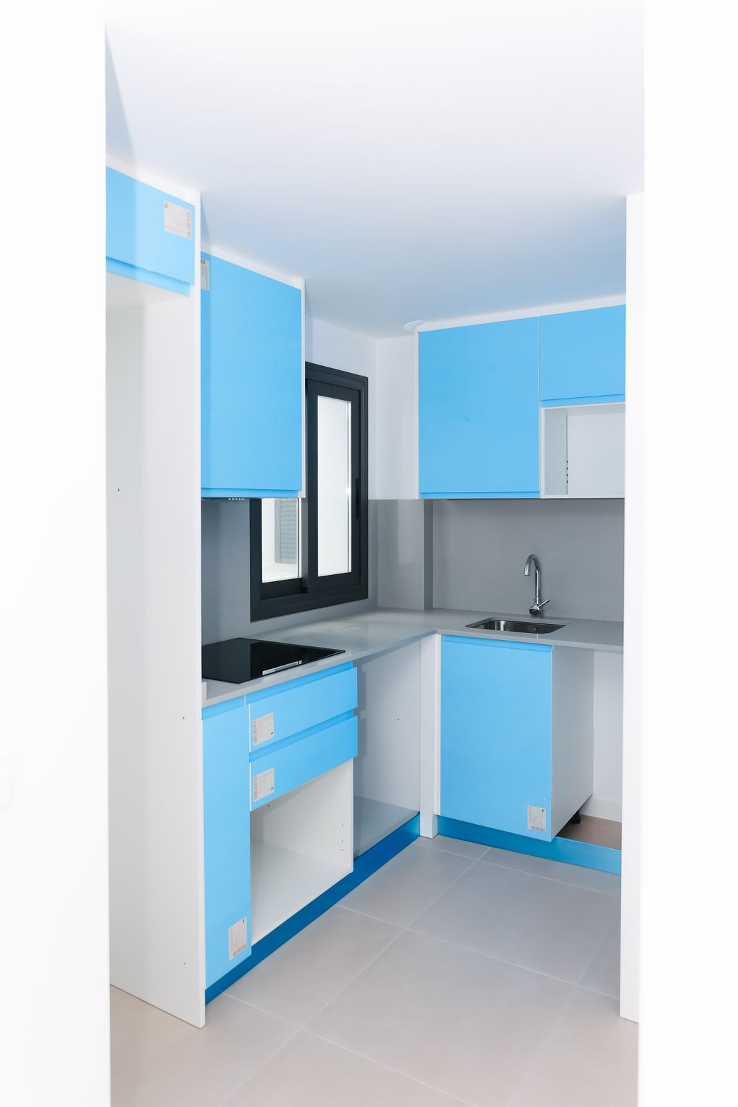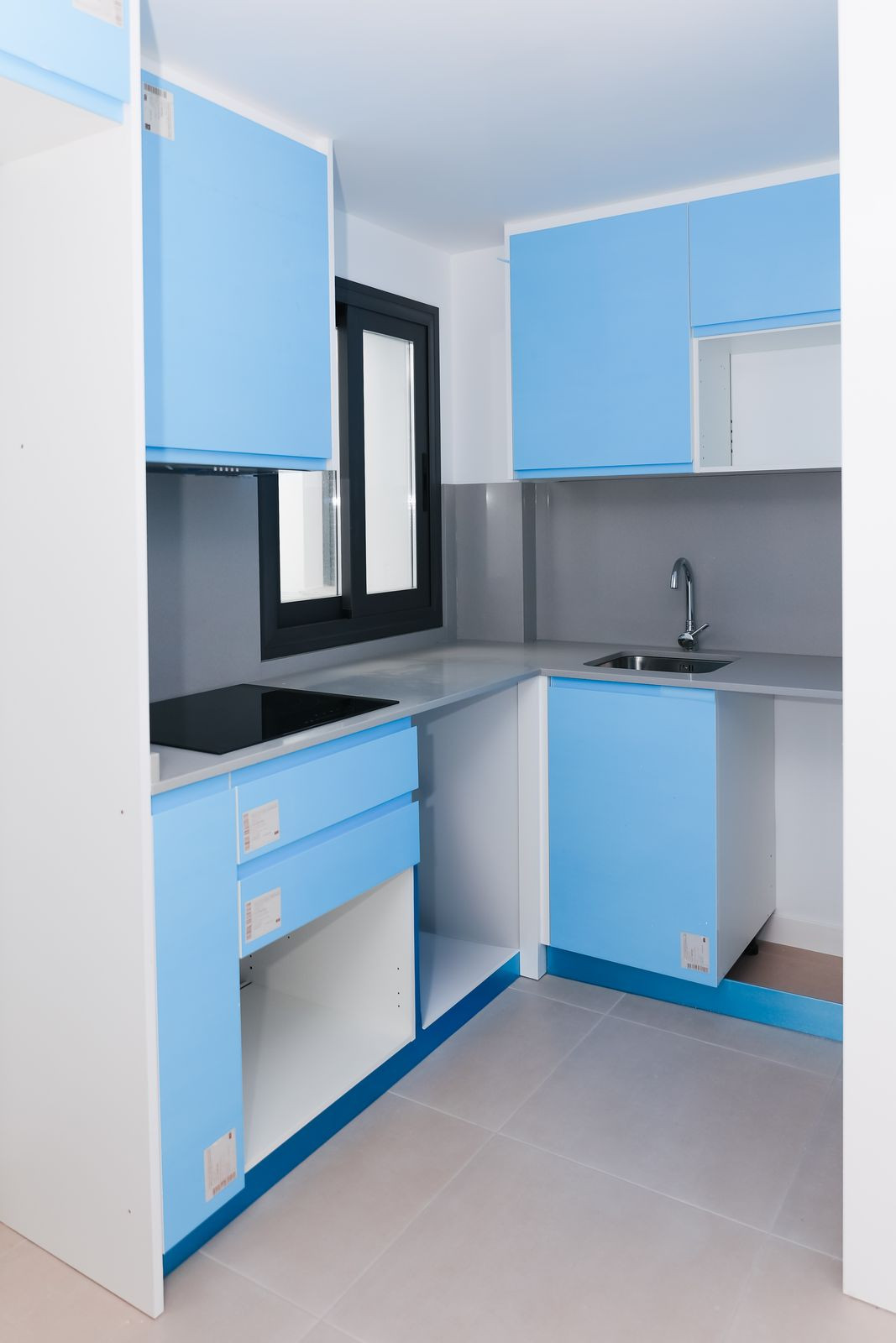 Cuisine équipée avec plaque de cuisson vitrocéramique, évier et hotte aspirante