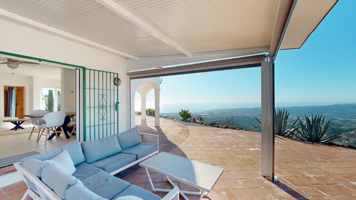 Cette villa récemment rénovée bénéficie d'un emplacement exceptionnel sur le mont Bentomiz à Arenas, à seulement 5 minutes du charmant village d'Arenas et ses maisons blanchies à la chaux, à 20 minutes des plages d'Algarrobo Costa et à 50 minutes de l'aéroport de Málaga. Elle offre un équilibre parfait entre tranquillité et accessibilité. La propriété se distingue par sa luminosité, son design moderne et ses finitions haut de gamme. Elle comprend un vaste séjour/salle à manger ouvert et une cuisine moderne entièrement équipée avec des appareils haut de gamme, dont une plaque de cuisson au gaz, un four, un lave-vaisselle et un réfrigérateur-congélateur intégré. La salle à manger s'ouvre sur une terrasse couverte, idéale pour se détendre ou prendre ses repas en plein air. La villa dispose de 3 chambres et 3 salles de bains, dont deux privatives. Au rez-de-chaussée, une chambre possède une salle de bains privative avec douche, WC et lavabo, ainsi que la climatisation. La deuxième chambre dispose d'une salle de bains séparée avec baignoire, douche, WC et lavabo. La suite parentale, située à l'étage, est climatisée et dispose d'une salle de bains privative avec douche, WC et lavabo, d'un dressing et d'un accès direct à une terrasse sur le toit offrant une vue panoramique imprenable et des couchers de soleil inoubliables. Toutes les chambres et le salon sont équipés de ventilateurs de plafond pour un confort optimal en été. L'espace extérieur comprend une piscine d'eau salée chauffée automatisée de 9,5 mètres sur 5 et un système d'arrosage automatique pour un jardin impeccable. La propriété bénéficie également d'un puits commun et d'une citerne d'une capacité de 12 000 litres. Plusieurs terrasses ombragées agrémentent l'espace extérieur, dont une peut être fermée par un store rétractable. La villa est dotée d'équipements de pointe, notamment 8 panneaux solaires avec un onduleur de 6 kW, le chauffage central, l'eau chaude sanitaire par chaudière à gaz, des fenêtres et portes à double vitrage avec système anti-effraction, un système de sécurité complet avec surveillance 24h/24 et 7j/7 et un système domotique contrôlant l'éclairage, la pompe à chaleur, les panneaux solaires et le niveau d'eau de la citerne. Cette propriété allie harmonieusement confort, style et durabilité dans un cadre exceptionnel. Contactez-nous dès aujourd'hui pour plus d'informations ou pour programmer une visite, en personne ou virtuelle.