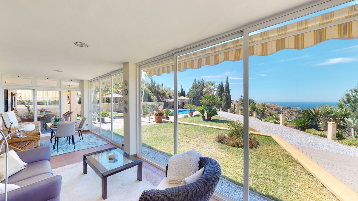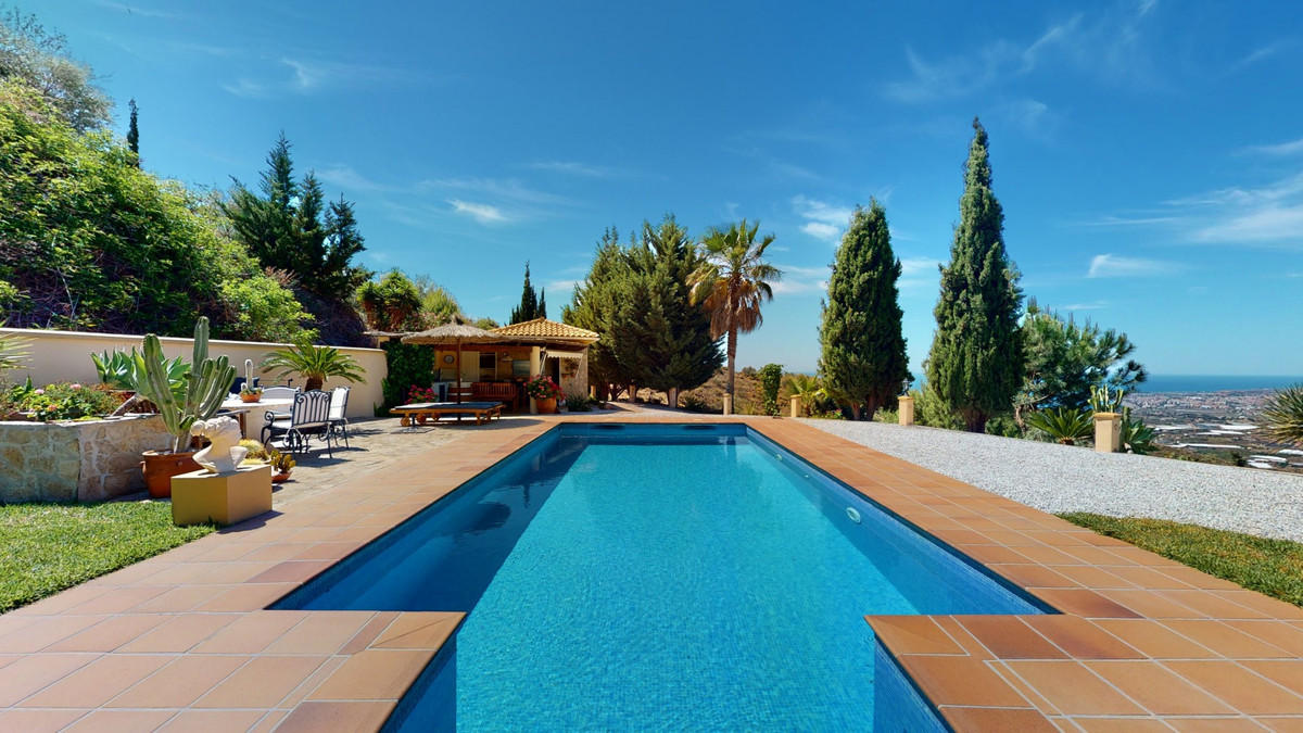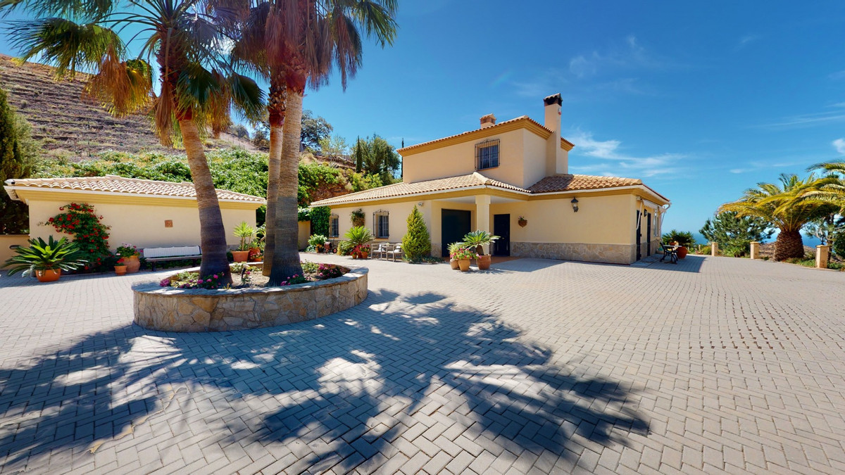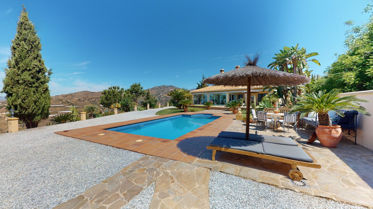 Une vue imprenable, une orientation sud-ouest idéale : la promesse d'un bonheur absolu. Cette villa d'exception, construite avec des matériaux de très haute qualité, offre un cadre idyllique avec un magnifique jardin comprenant spa, sauna et piscine, ainsi qu'une luxueuse cuisine d'été avec coin repas intégré. Située entre Algarrobo et Sayalonga, cette villa unique vous propose tout cela et bien plus encore. Son emplacement privilégié garantit une intimité totale et vous offre une vue romantique sur le coucher du soleil, se reflétant tantôt sur la Méditerranée, tantôt, selon la saison, sur le fabuleux paysage montagneux de Malaga. Un chemin privé asphalté, bordé de pins, mène à l'imposante entrée de la propriété, où un îlot de palmiers se dresse au milieu d'un rondin. Plusieurs places de parking, un garage et un grand abri voiture complètent le rez-de-chaussée. Au premier étage se trouvent le salon avec une cheminée séparée, des toilettes invités, une buanderie, une cuisine moderne donnant sur une véranda spacieuse et parfaitement équipée, ainsi qu'une très belle chambre avec salle de bains privative. À l'étage de la villa se trouve la suite parentale avec une spacieuse salle de bains privative et un dressing. La propriété est équipée du chauffage central, de la climatisation et d'une cheminée. Le terrain est agrémenté d'une variété d'arbres fruitiers, de palmiers, de plantes tropicales et de pins. La plage et la mer, ainsi que le golf et le port de plaisance de Caleta, sont à 15 minutes, et l'aéroport de Malaga à seulement 40 minutes. Nous serions ravis de vous présenter prochainement cette propriété de rêve, en personne ou par visite virtuelle. Car ce monde est unique, à l'image de notre Axarquía. En Andalousie. Sur la Costa del Sol. Ici, sous le soleil…