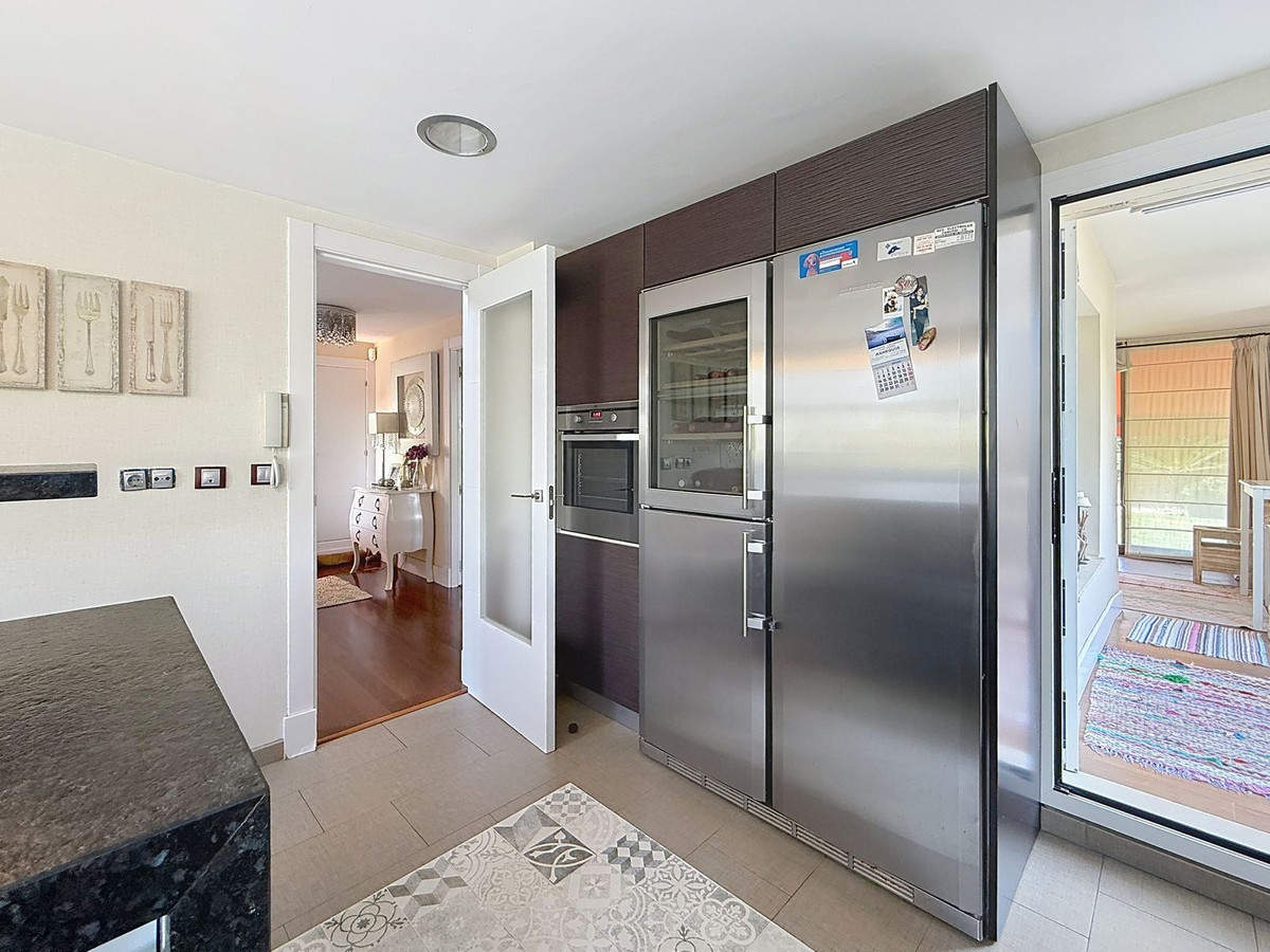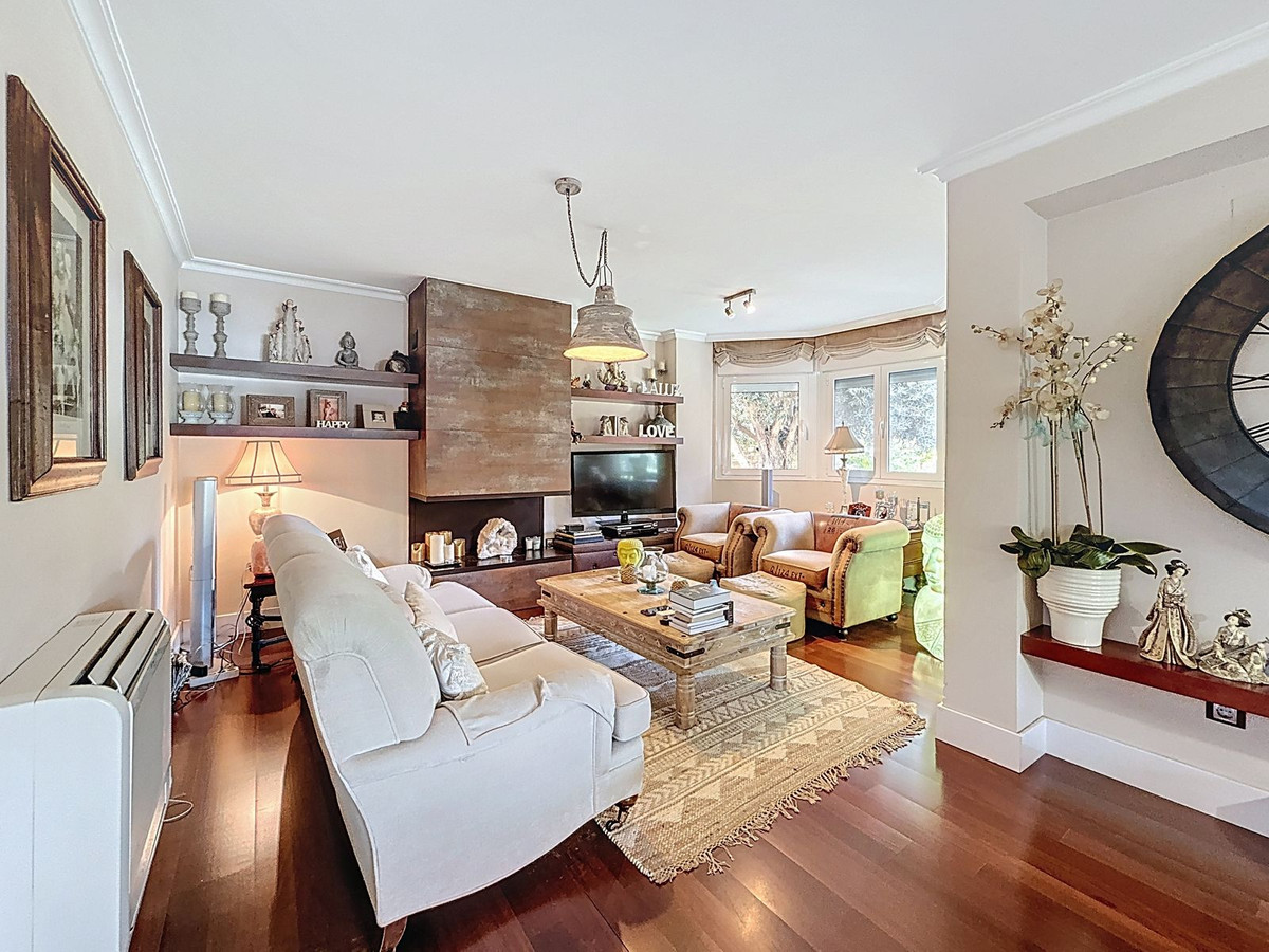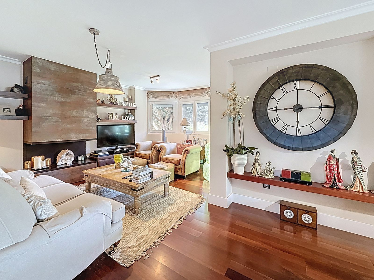 La villa vous accueille avec un hall d'entrée lumineux et des toilettes séparées, avant de dévoiler d'élégants espaces de vie baignés de lumière naturelle. Le salon et la salle à manger, avec leur cheminée chaleureuse et leurs gracieuses fenêtres cintrées, offrent une vue imprenable sur les magnifiques jardins. La cuisine moderne, dotée d'un sol en céramique imitation bois, allie style contemporain et grande facilité d'entretien.