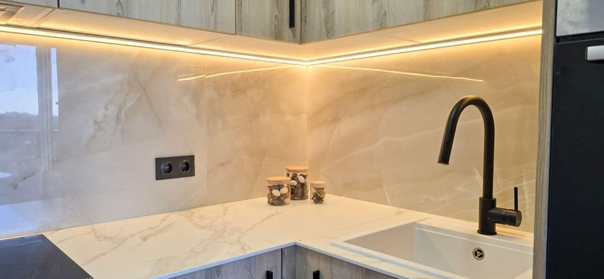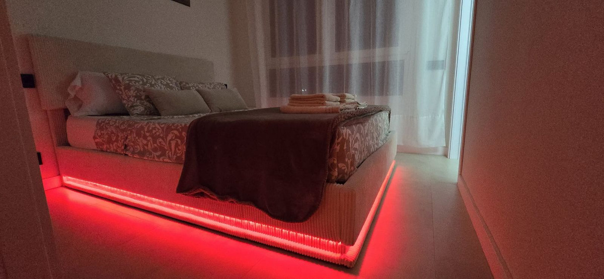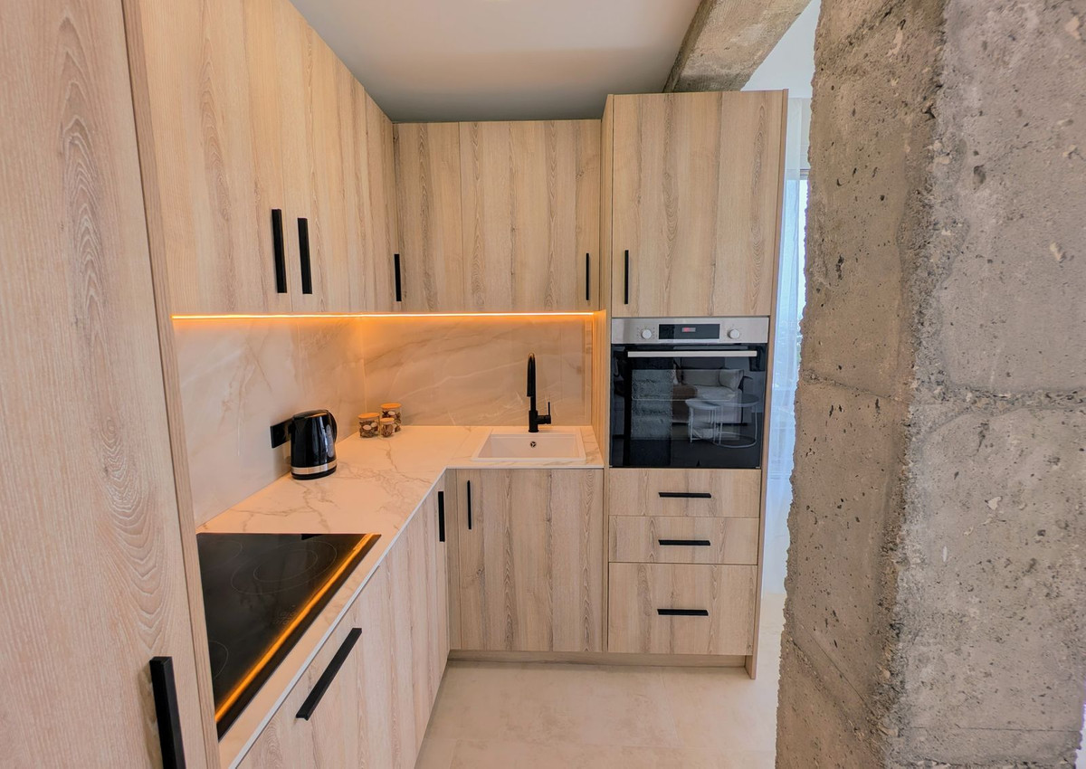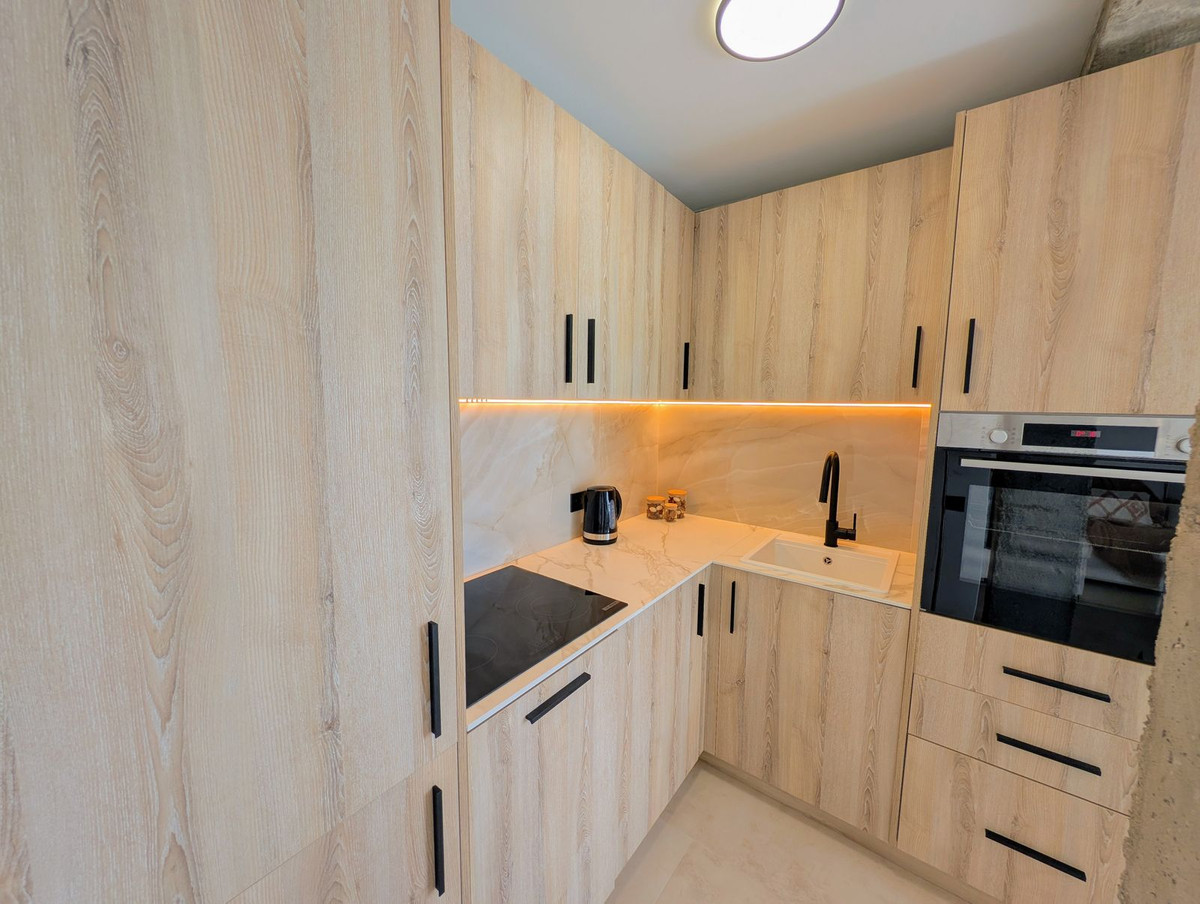 The fully equipped kitchen includes LED ambient lighting and top-tier German-made Bosch appliances, including a dishwasher and washing machine, all selected for performance and reliability.