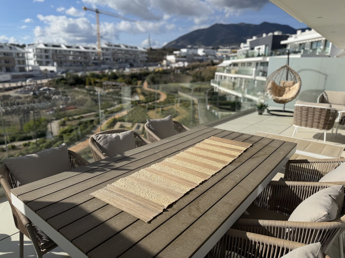 The apartment offers a practical and beautiful layout with a bright living room connected to an open kitchen and direct access to a large southwest-facing terrace. The master bedroom has an en-suite bathroom and access to a private terrace with views over the communal pool. The second bedroom has built-in wardrobes and a separate bathroom.