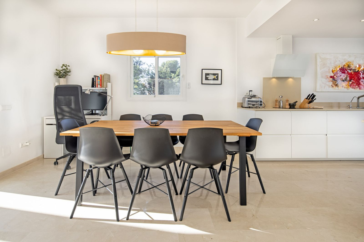 Welcome to this stunning corner semi-detached duplex townhouse, perfectly positioned in the heart of the prestigious Golf Valley and offering breathtaking panoramic views over Aloha Golf and the Mediterranean Sea. Located within the charming and tranquil community of La Retranca del Ángel, residents enjoy abundant parking, beautifully landscaped gardens, and a pristine communal pool. The setting is ideal—peaceful yet just moments away from local amenities, the beach, vibrant Puerto Banús, and the renowned Aloha College.