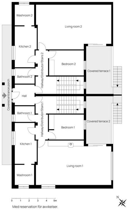 Le rez-de-chaussée, accessible directement depuis l'entrée, offre un agencement généreux conçu pour faciliter la vie en colocation et s'adapter à différents besoins. Ce niveau comprend de vastes espaces de vie, deux séjours-salles à manger lumineux et deux cuisines, chacune équipée pour le quotidien et les réunions de famille. On y trouve également deux chambres, deux salles de bains et l'escalier menant à l'étage.