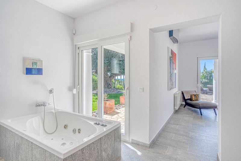 À l'extérieur, vous découvrirez un magnifique jardin paysager arboré, organisé autour d'un majestueux olivier et agrémenté d'une superbe piscine chauffée. La villa bénéficie d'une vue imprenable sur la mer et les montagnes, d'une intimité totale et d'une orientation plein sud qui lui assure une luminosité exceptionnelle tout au long de la journée. La vaste terrasse est idéale pour les repas en plein air et les réceptions.
