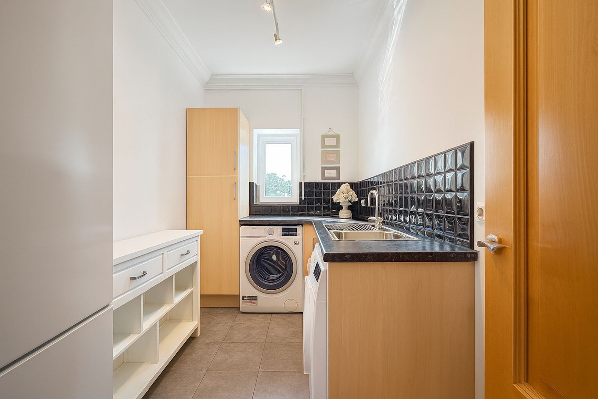 Au même étage se trouve une cuisine moderne ouverte sur une buanderie, ce qui optimise la circulation et facilite l'accès. À l'étage inférieur, quatre chambres lumineuses et spacieuses disposent chacune d'une salle de bains privative et de placards intégrés.