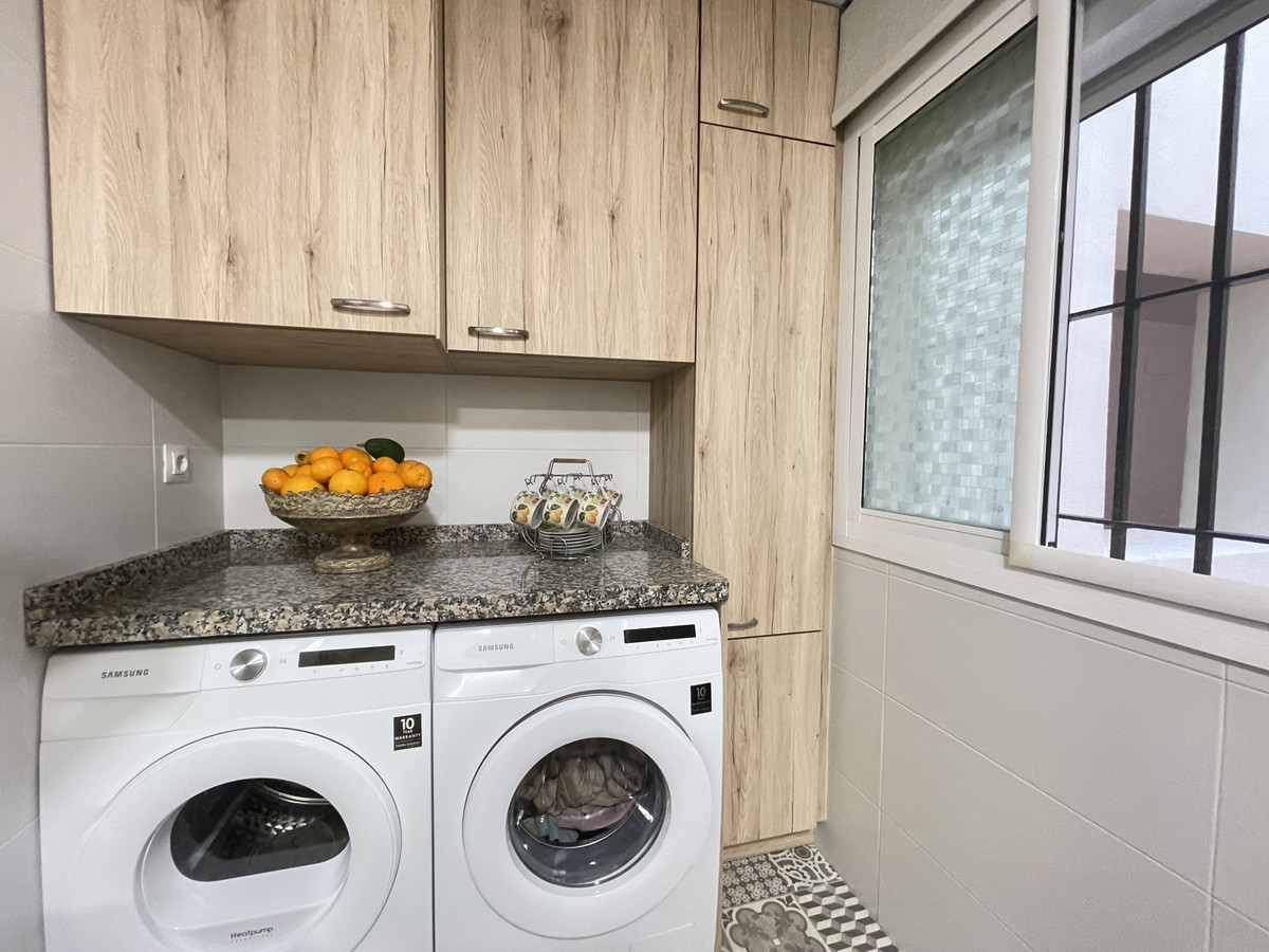 Ce bien, quasiment neuf après une rénovation complète, comprend deux chambres et une salle de bains. Parmi ses pièces, un dressing spacieux offre un espace de rangement optimal. L'appartement est climatisé et dispose de carrelage au sol et de placards intégrés, des éléments qui allient confort et fonctionnalité. La cuisine entièrement équipée comprend une buanderie pratique.