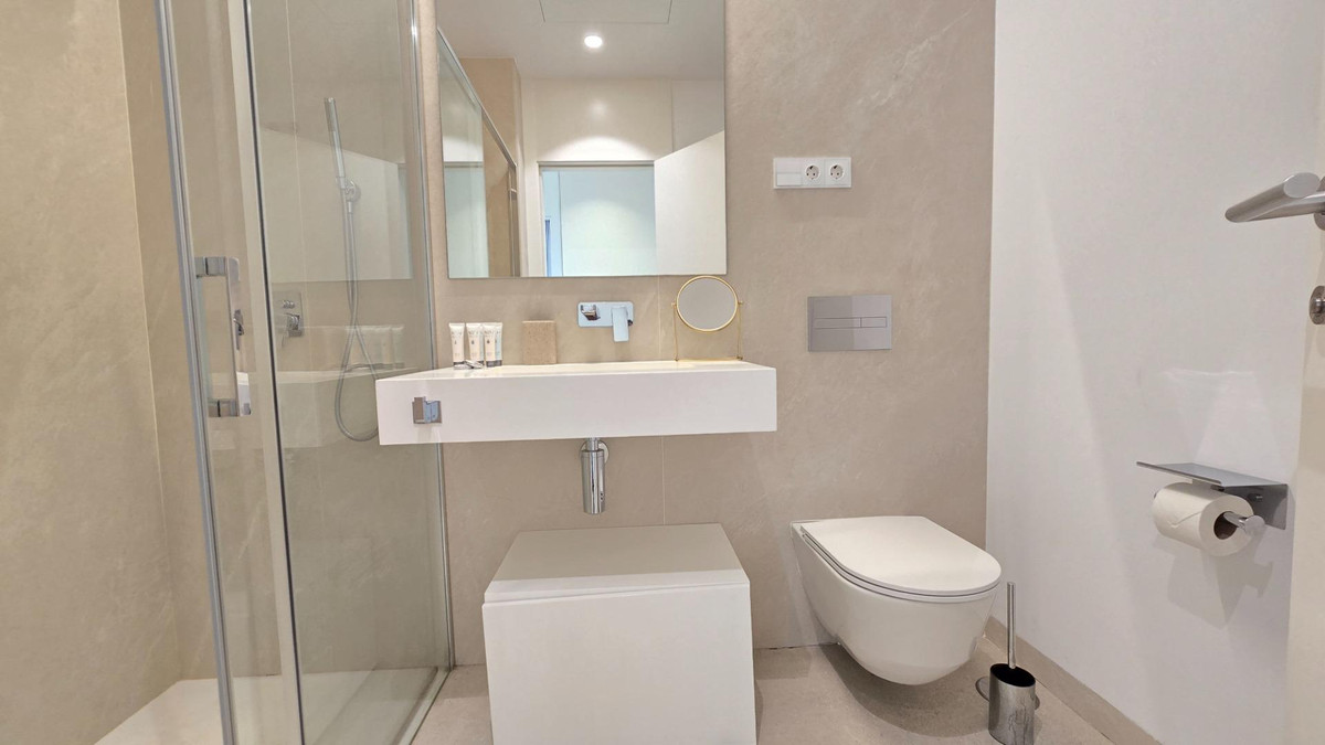 The master bedroom is an authentic private retreat with an en-suite bathroom that includes a shower and bathtub, offering a unique wellness environment. The other bedrooms also stand out for their spaciousness, natural light, and built-in wardrobes, while the additional bathroom incorporates a walk-in shower, premium faucets, and sophisticated stone finishes. The guest toilet completes the layout with a modern design in stone and wood.