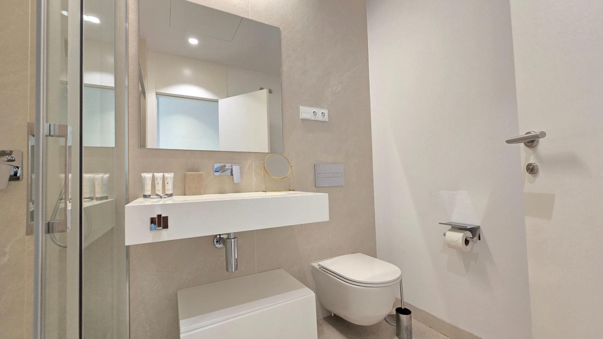 The open-plan living and dining room integrate with a large private terrace from where you can enjoy unbeatable views of the Mediterranean and unforgettable sunsets. The designer kitchen, equipped with state-of-the-art appliances, quartz countertops, and elegant furniture, provides both style and functionality. The apartment also offers a private balcony ideal for outdoor dining, central air conditioning, and smart home features.