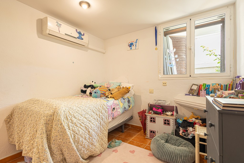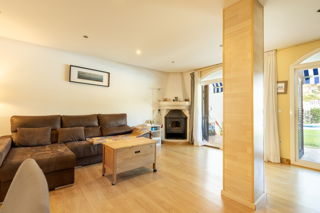 Rez-de-chaussée : Accès par un escalier de 12 marches, hall d’entrée avec placard intégré, spacieux séjour-salle à manger avec placard de rangement et cheminée, accès à une grande terrasse exposée sud-ouest avec table à manger et barbecue donnant sur la piscine et le jardin commun.