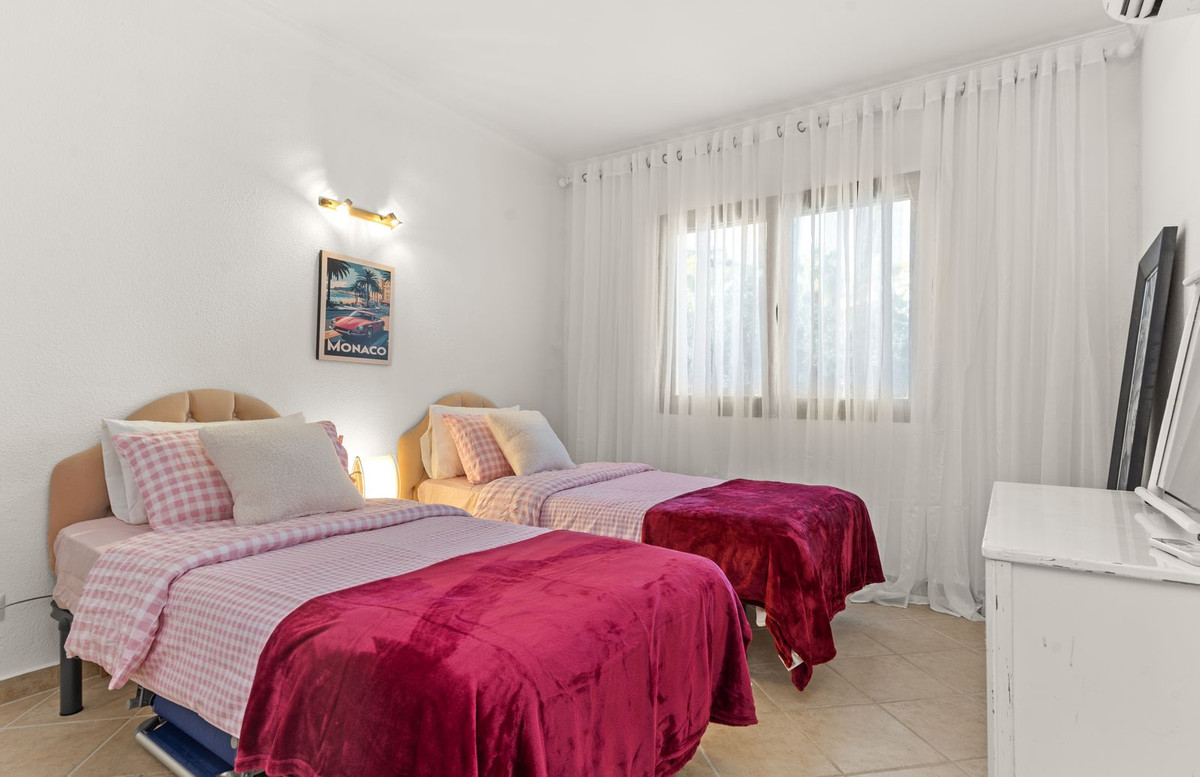 La chambre d'amis double, accessible par un long couloir privé, comprend deux lits simples, d'élégants rideaux blancs en voile et deux armoires coulissantes intégrées en bois. La salle de bains attenante, spacieuse et entièrement rénovée, est dotée d'un carrelage contemporain, d'un meuble vasque en marbre et de spots encastrés au plafond.