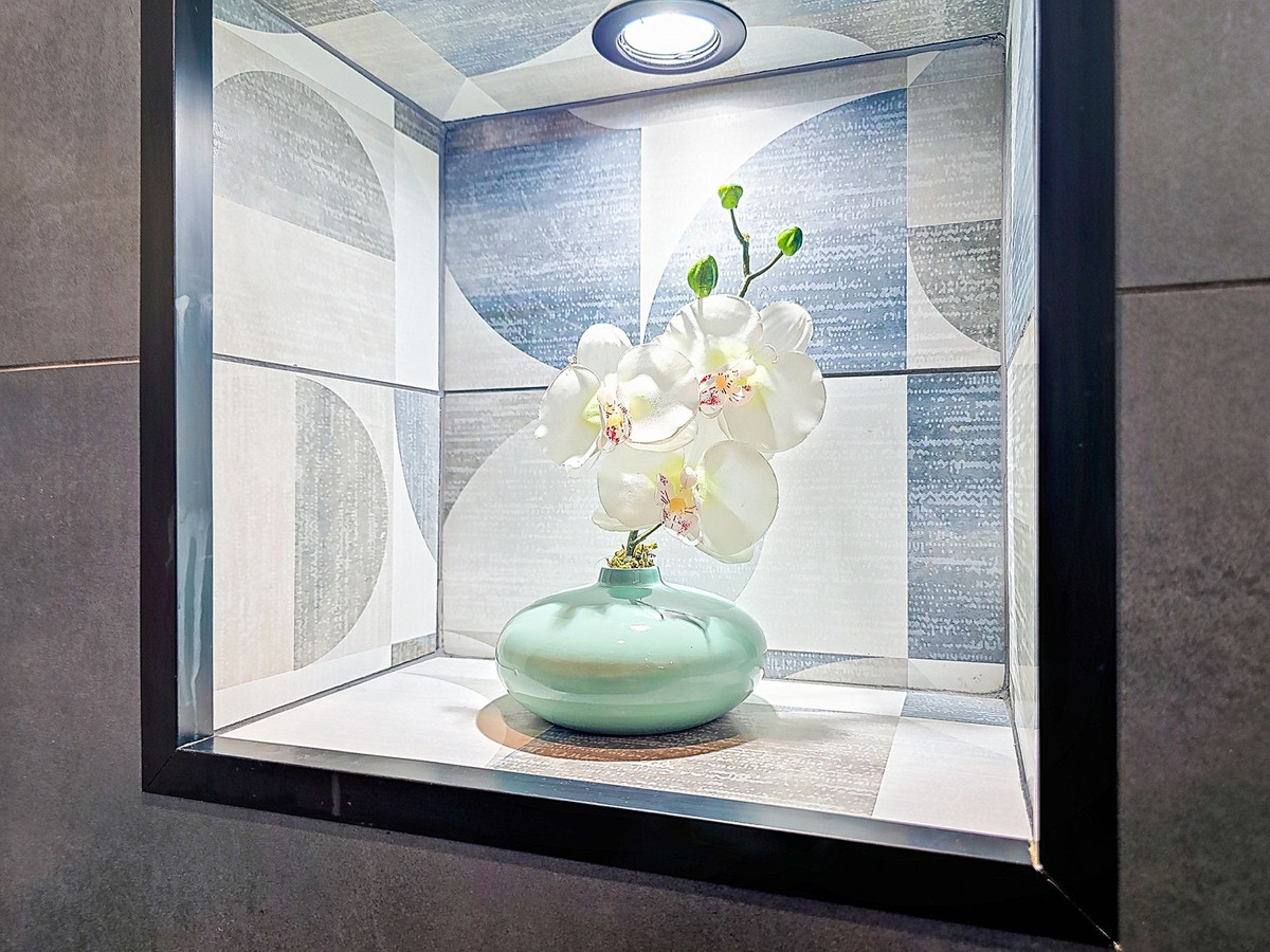On one side of the house there is a secluded dining area with tiled modern banquette seating area and smoked glass