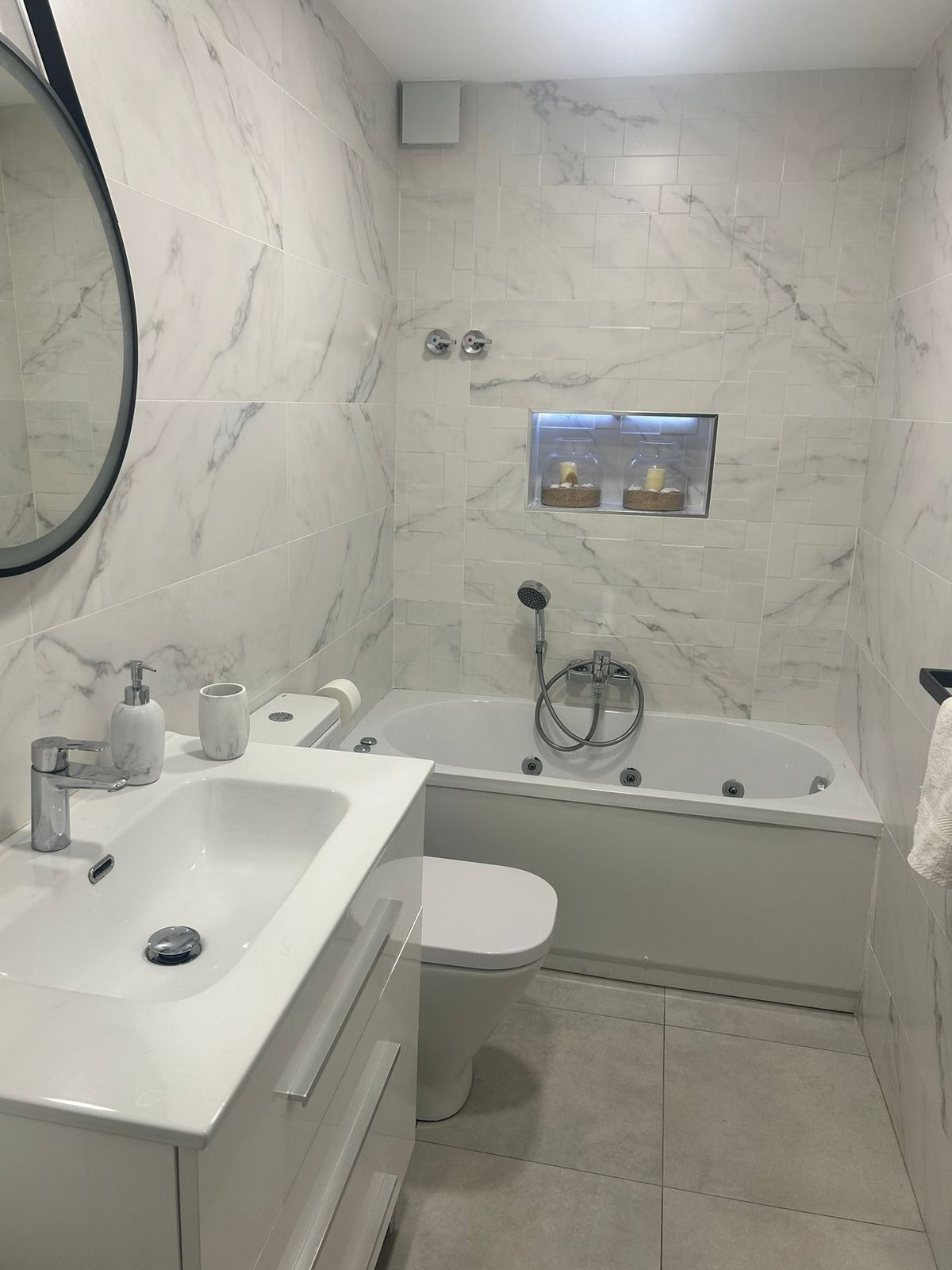 Maison de ville récemment rénovée à Arroyo de la Miel, offrant confort moderne et espaces de vie généreux. Elle comprend trois chambres, dont une suite parentale avec dressing et une autre avec placards intégrés. Deux salles de bains entièrement équipées, l'une avec baignoire hydromassage et l'autre avec douche à l'italienne. L'élégante cuisine a été rénovée avec un îlot central et un plan de travail en Silestone. Un cellier double hauteur offre un espace de rangement supplémentaire appréciable. La maison est équipée d'une climatisation réversible et d'une cheminée dans le séjour. Profitez de terrasses privatives à l'avant et à l'arrière, de volets roulants de sécurité, d'une porte d'entrée renforcée et de l'absence de charges de copropriété.